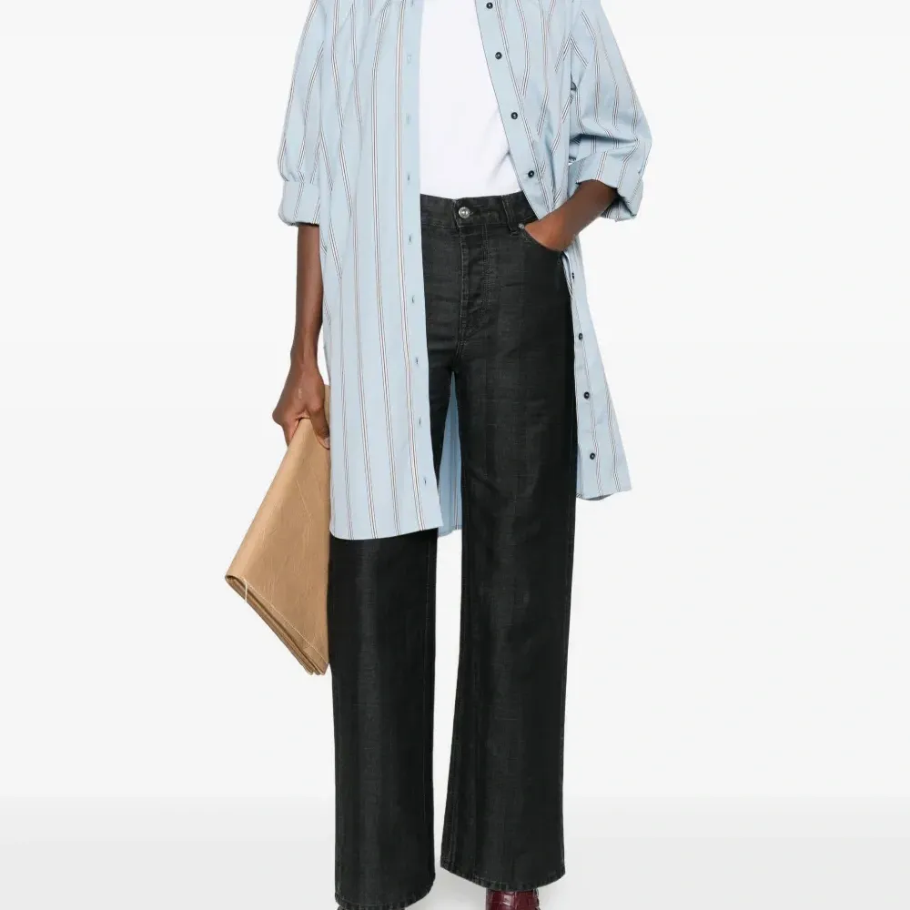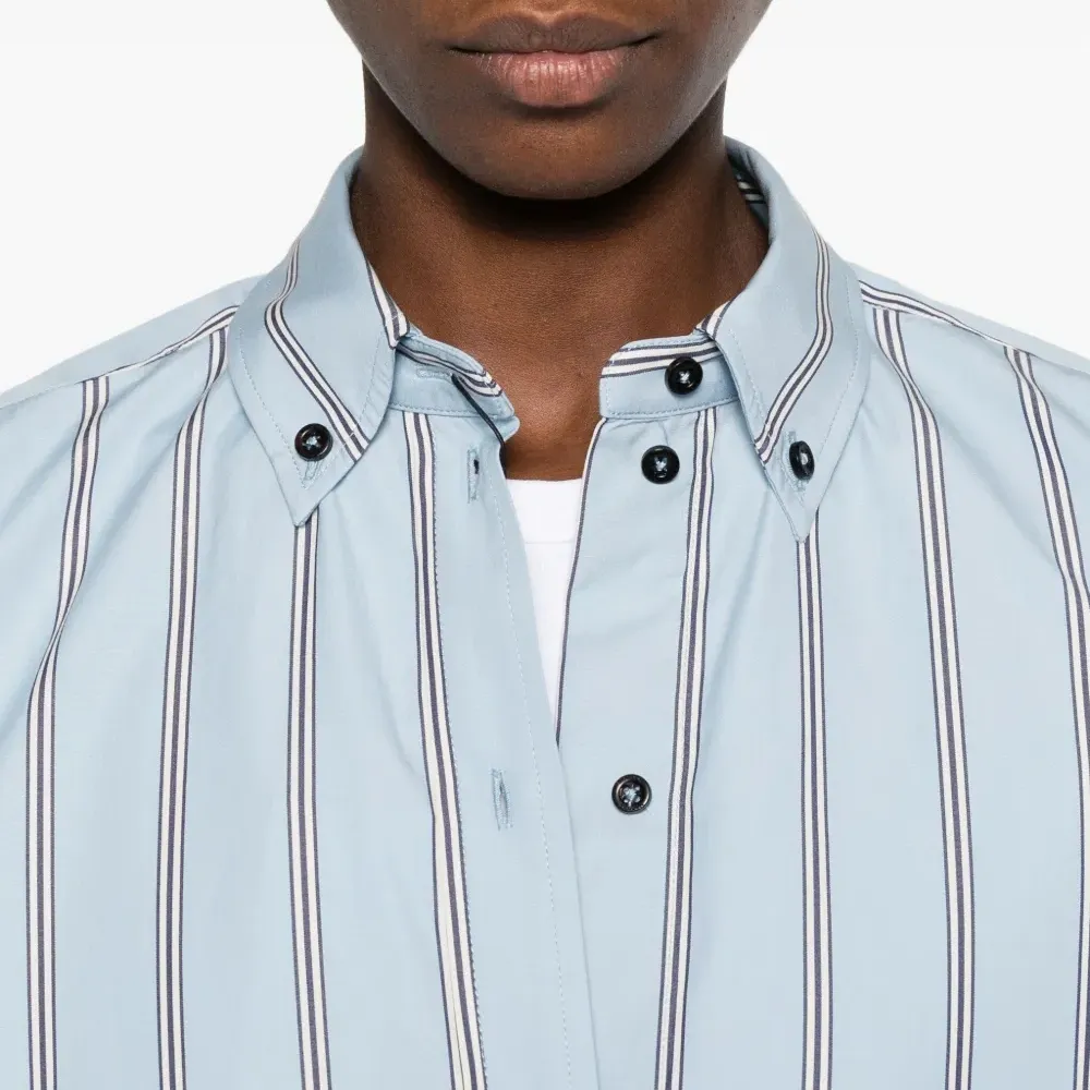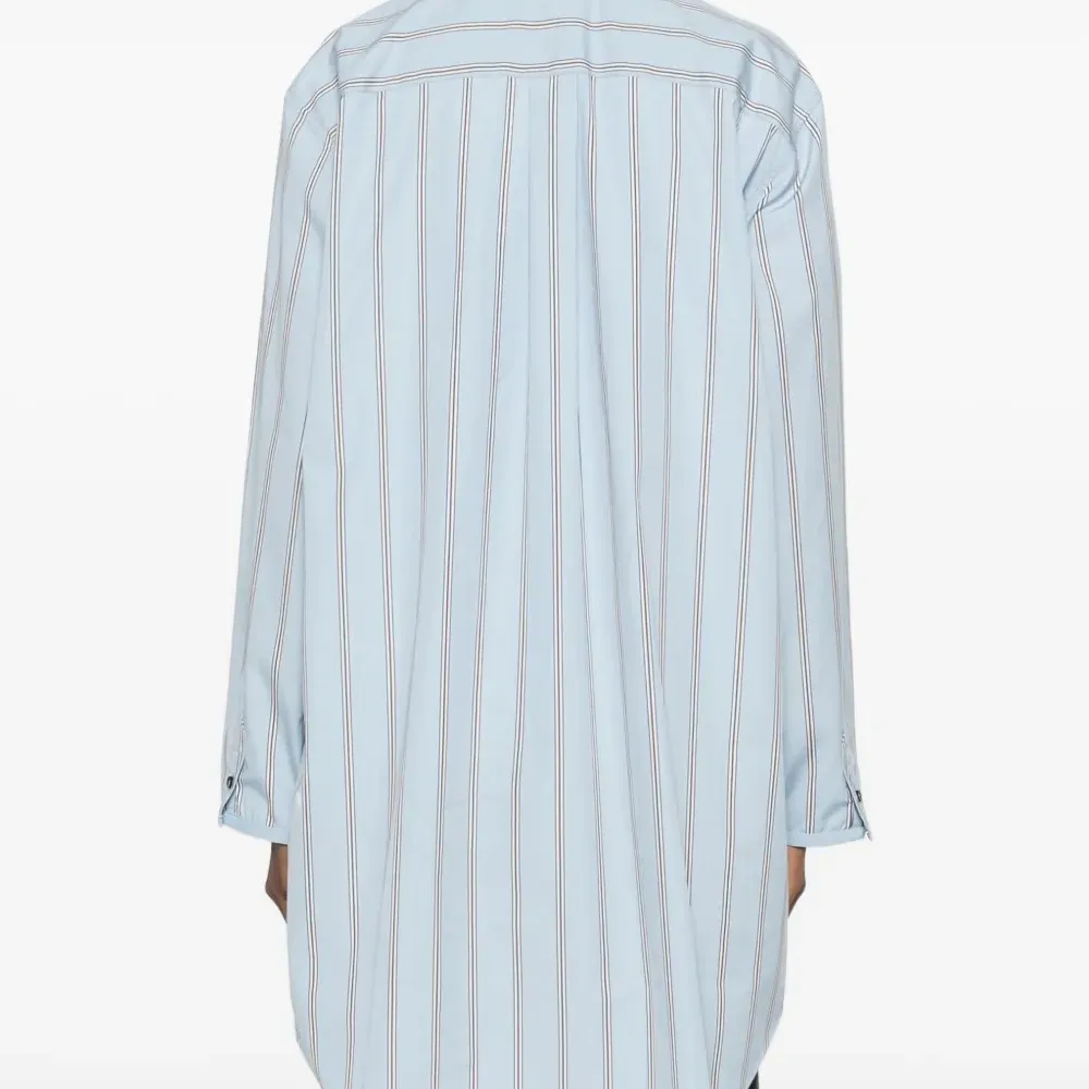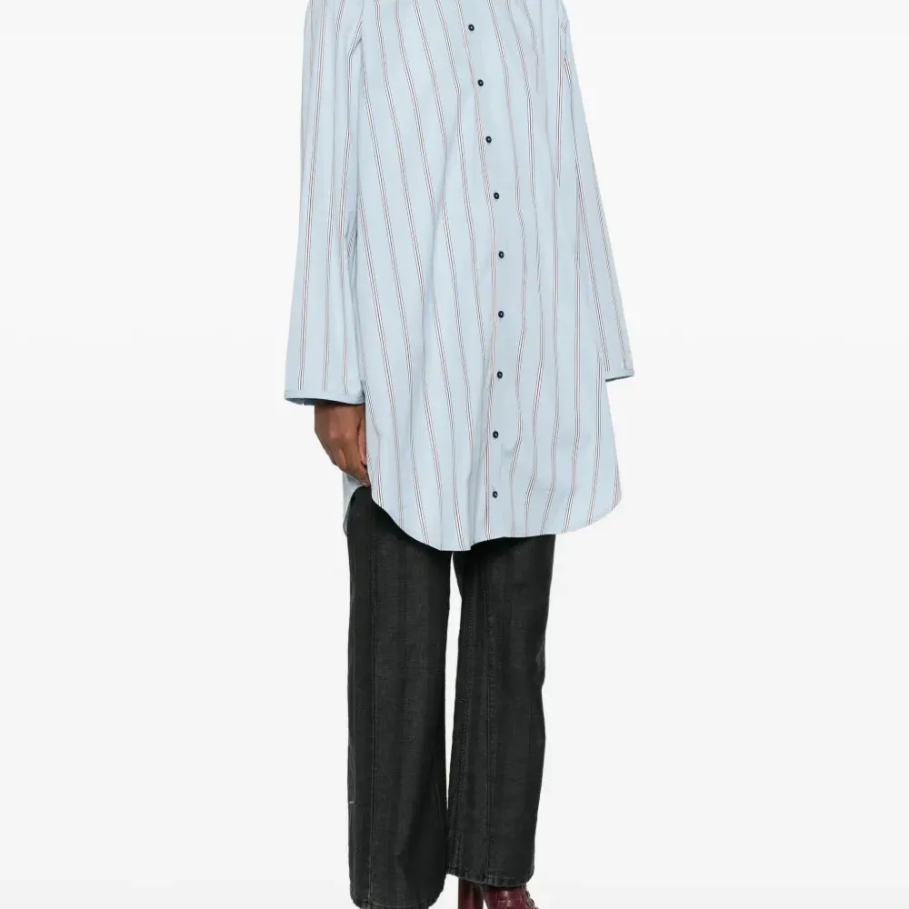 синие вертикальные полоски, застегивается на пуговицы, воротник-пуант
