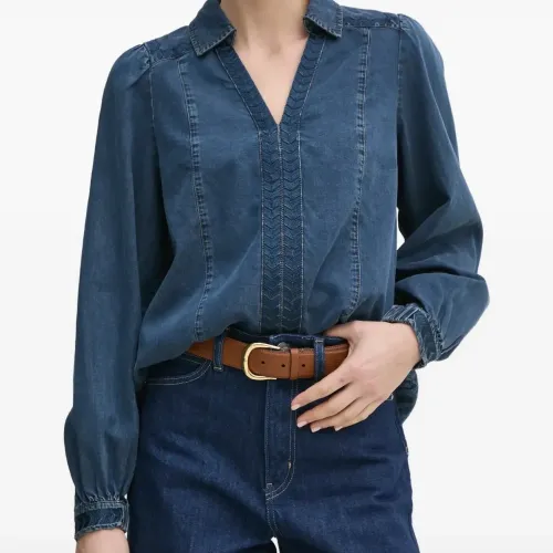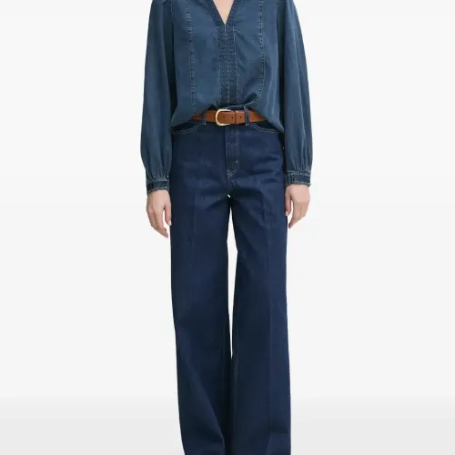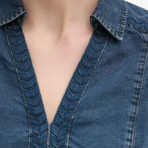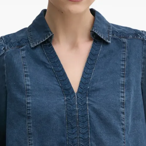 джинсово-синий, V-образный вырез, вышивка, длинные рукава, застёжка на пуговицы, с воротником