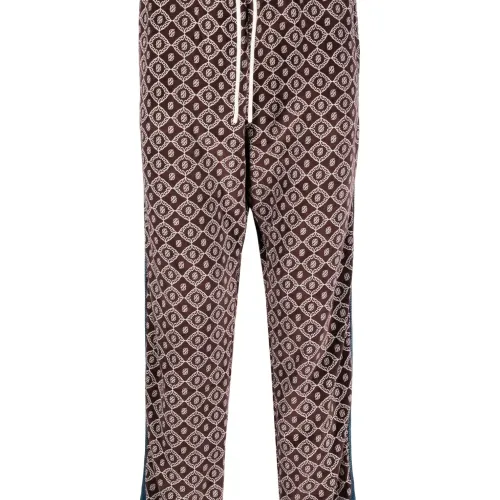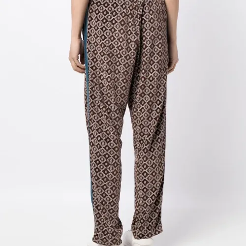 Шоколадный, белый, синий, смесовый хлопок, бархат, узор с изображением монограммы, полоска сбоку, кулиска на талии и два вшитых кармана по бокам.