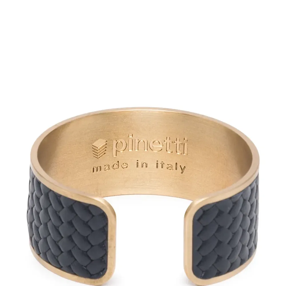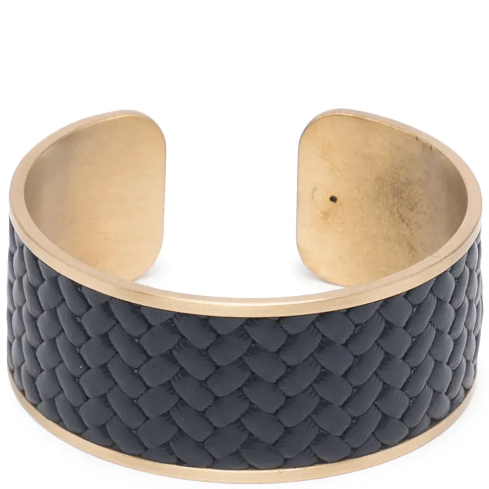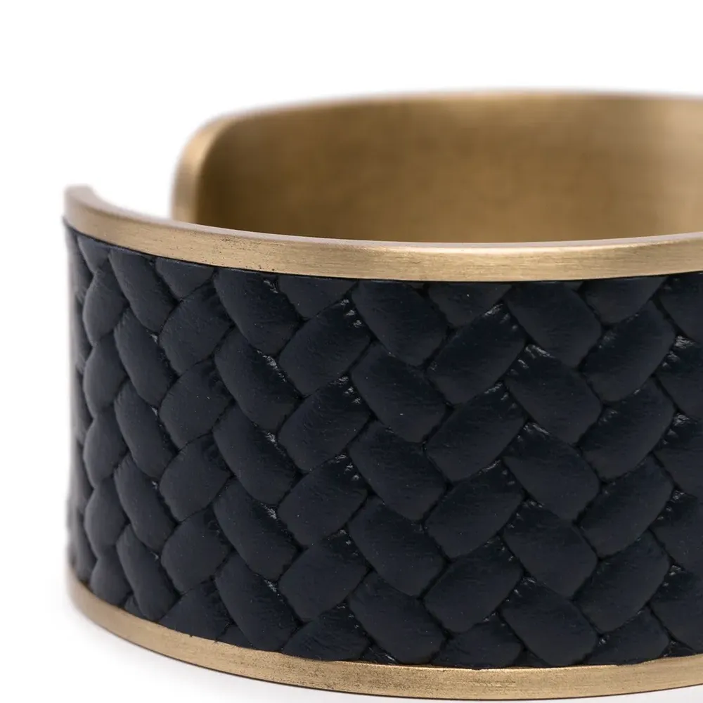 Золотистая фурнитура, переплетенный дизайн и выгравированный логотип.