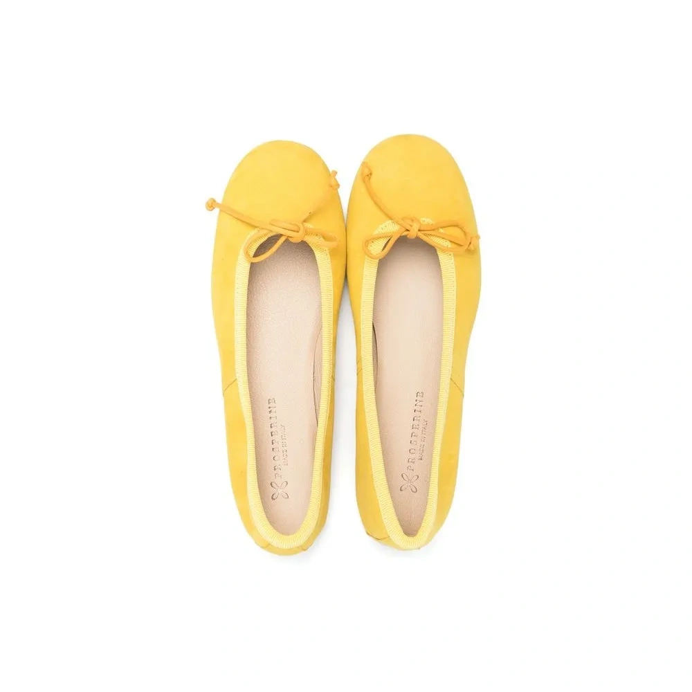 Канареечный, телячья кожа, бант, закругленный носок, плоская подошва и модель без застежки.