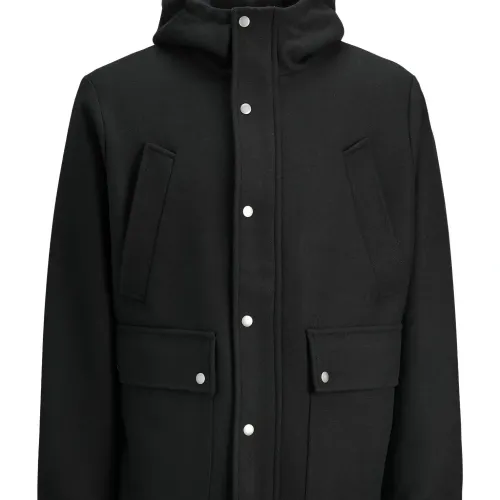 черный с капюшоном, застежка на пуговицы, нагрудные карманы, передние карманы