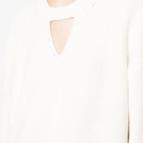 Цвет слоновой кости, хлопок, V-образный вырез, вырезные детали, круглый вырез, приспущенные плечи, длинные рукава и манжеты с разрезами.