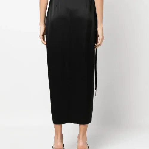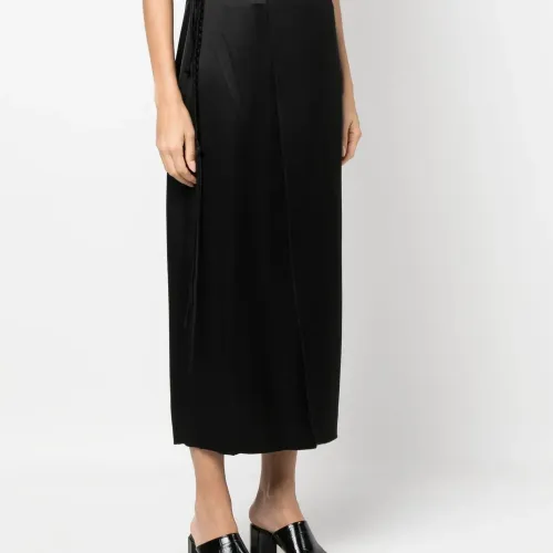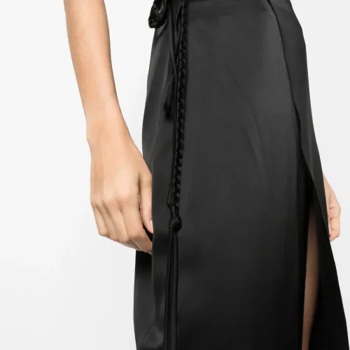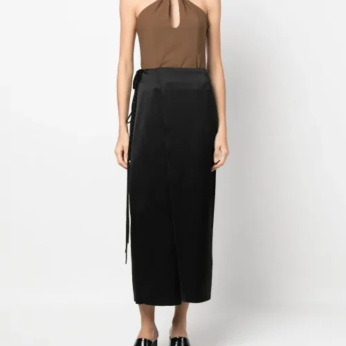 Черный, сатиновая фактура, завышенная талия, модель на запах, завязки по бокам, боковой разрез и длина до середины икры. Узнать больше о том, какие товары получают отметку «Ответственный выбор», можно из материала «Как мы оцениваем экологичность и этичность».
