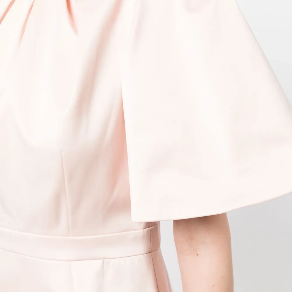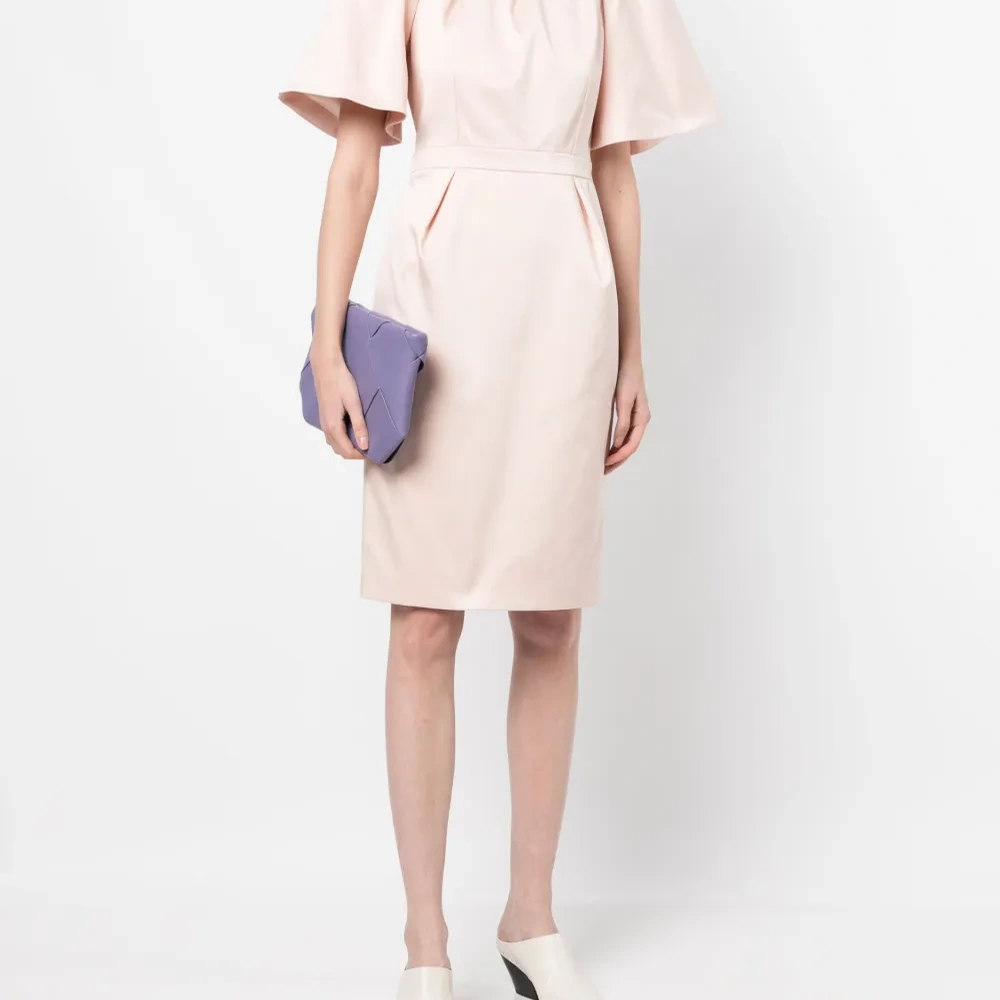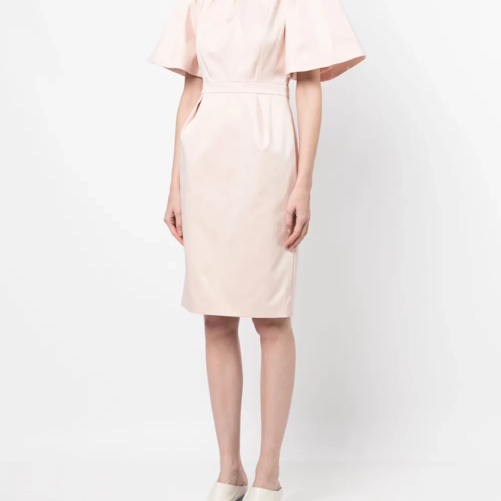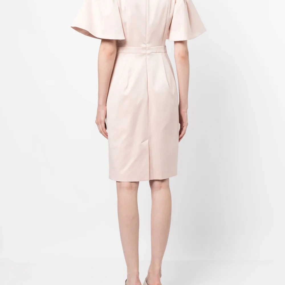 Светло-розовый, сатиновая фактура, складки, вырез сзади, круглый вырез, застежка на молнии сзади, рукава-воланы, приталенный силуэт и длина по колено.