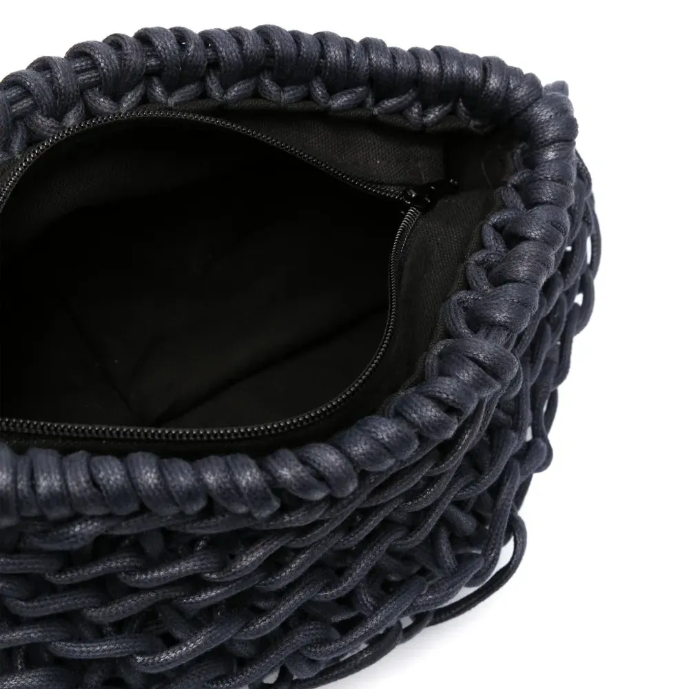 Темно-синий, смесовый хлопок, кожаная отделка, переплетенный дизайн, застежка на молнии сверху, ремень на плечо, основное отделение и цельная подкладка. Узнать больше о том, какие товары получают отметку «Ответственный выбор», можно из материала «Как мы оцениваем экологичность и этичность».