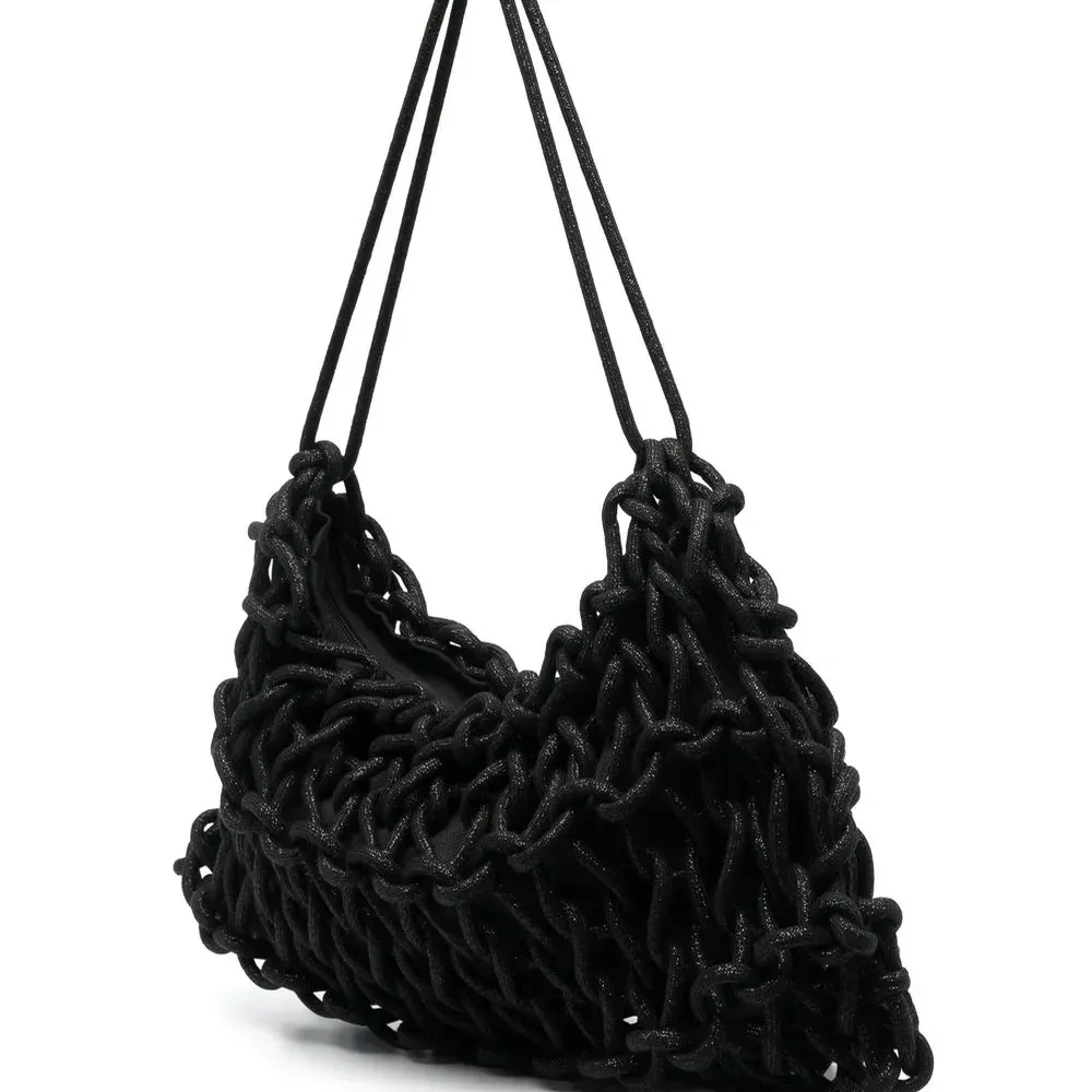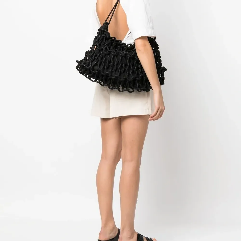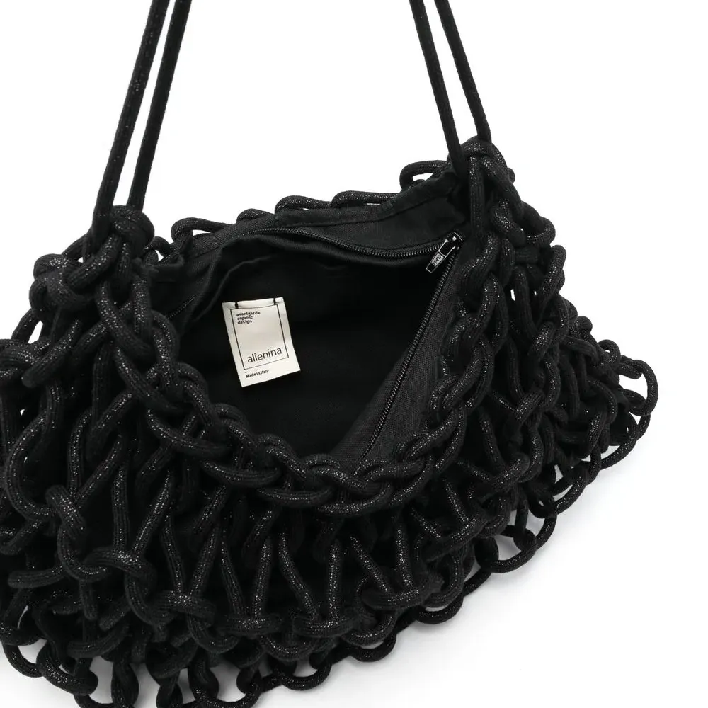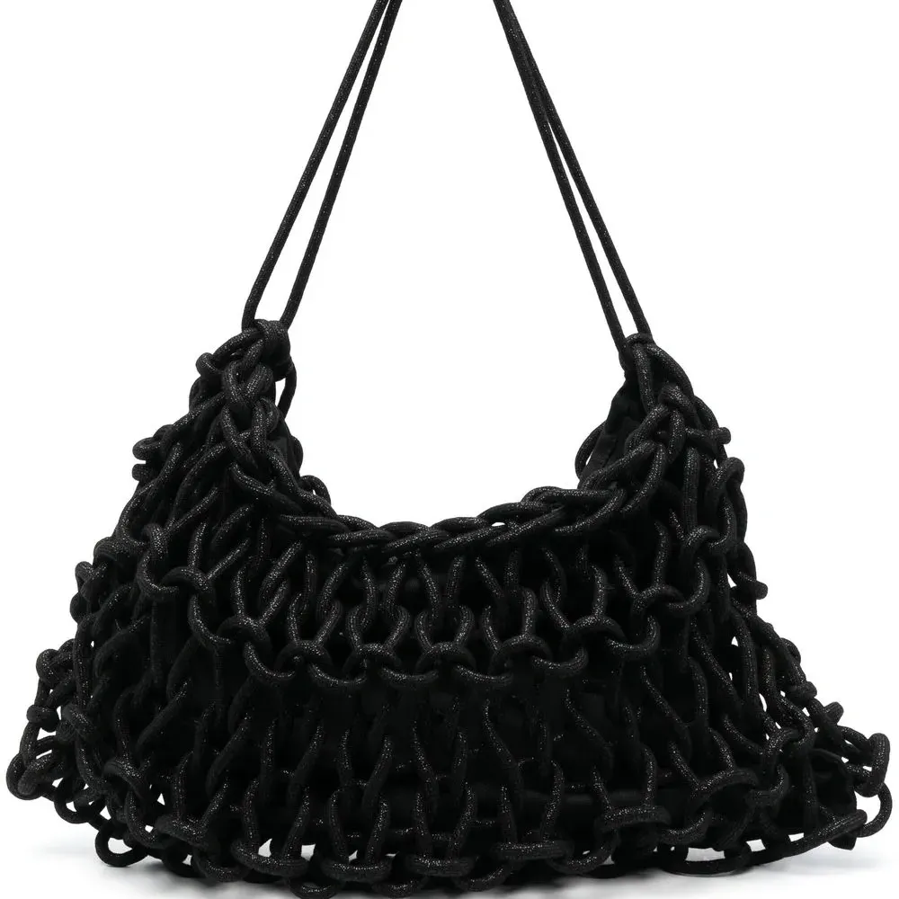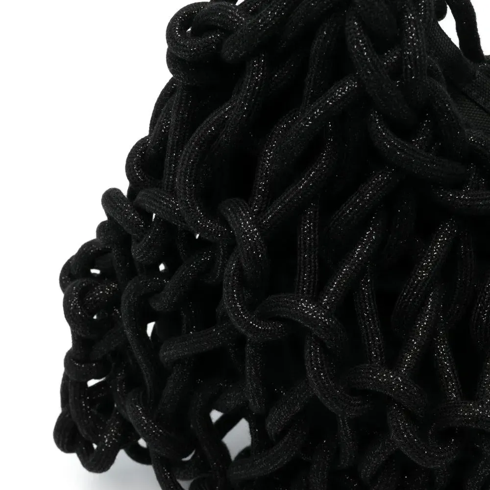 Черный, смесовый хлопок, переплетенный дизайн, вощеный материал, вставки из люрекса, ремень на плечо, застежка на молнии сверху и основное отделение. Ответственный выбор: Мы объединились с агентством Good On You, которое оценивает бренды по степени их влияния на животных, людей и планету в целом. Этот бренд использует этичные по отношению к животным практики, поэтому получил хорошую оценку.