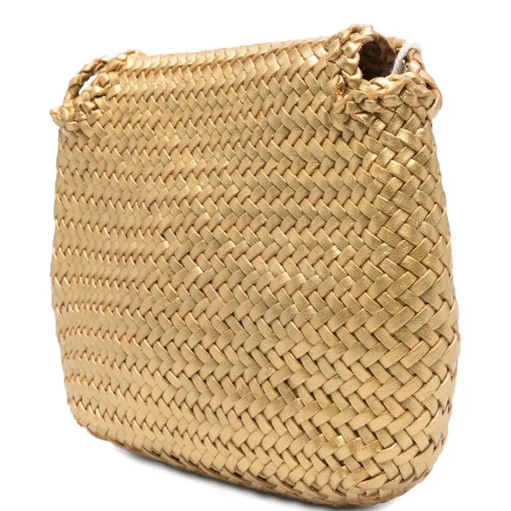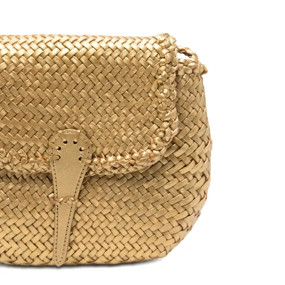 золотистая плетёная кожаная сумка с клапаном, кожаной застёжкой и наплечным ремнем