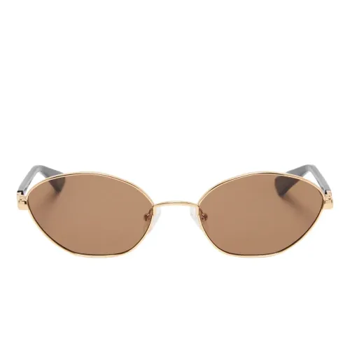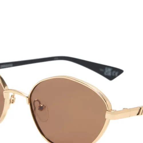 оправа геометрической формы золотистого цвета, носовые упоры, тонированные линзы, дужки черного цвета. Очки поставляются с защитным футляром.
