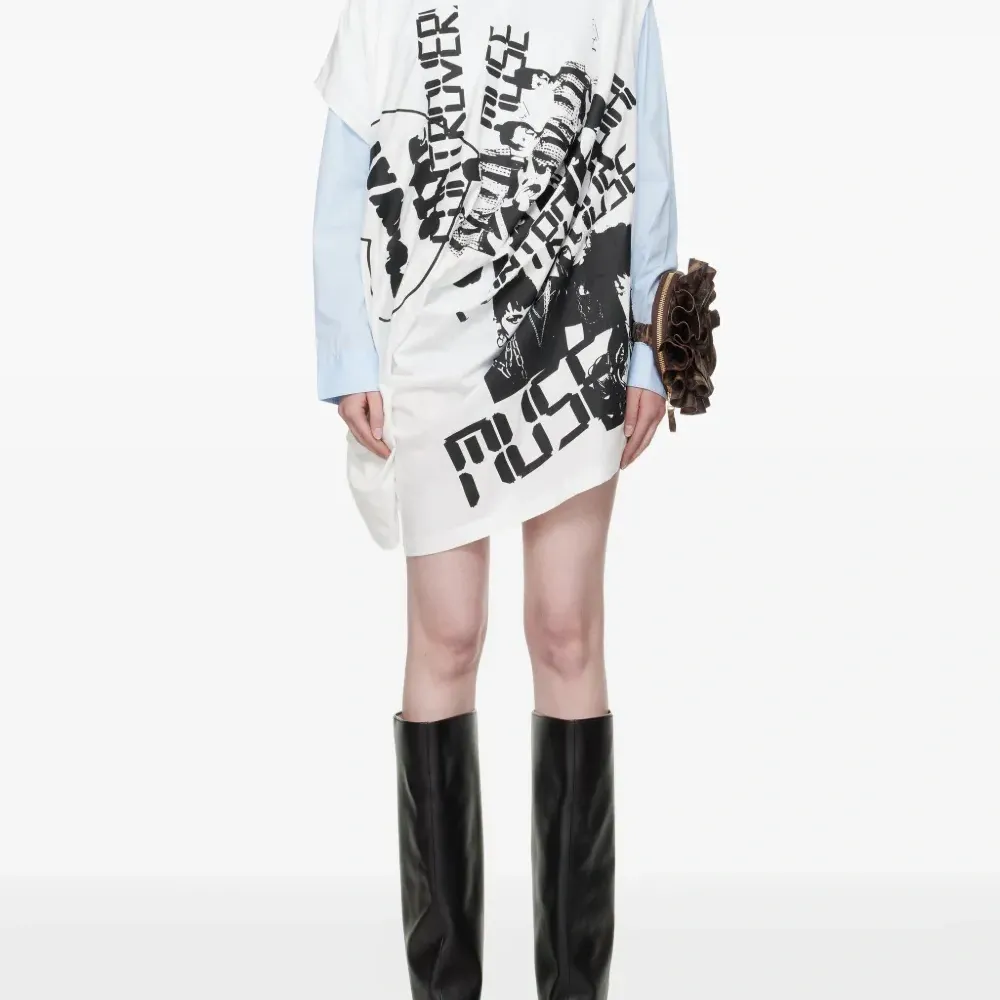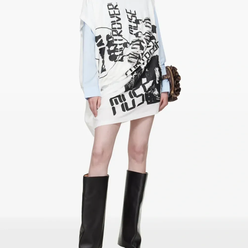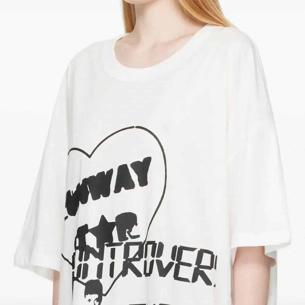 футболка цвета экрю с графическим принтом, асимметричным подолом, короткими рукавами, свободным кроем и боковыми разрезами