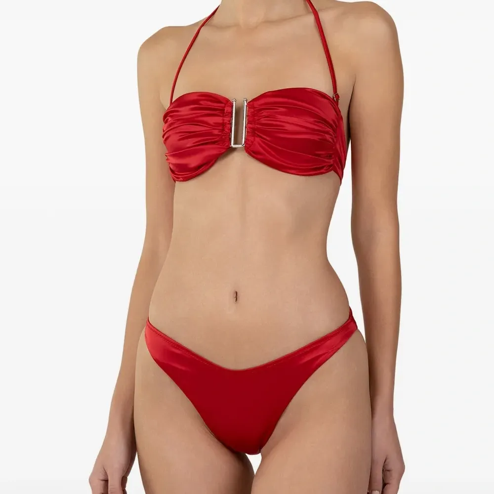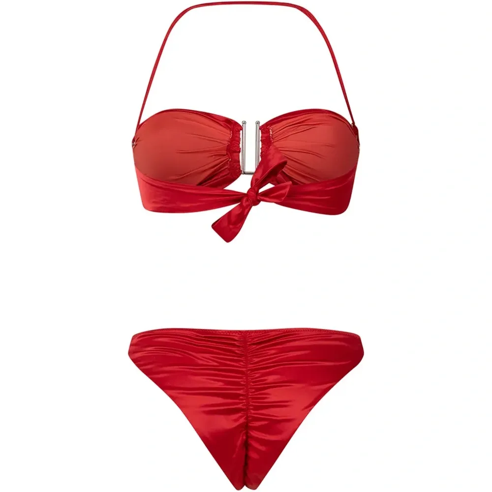 красный купальник с завязками, сборками и на бретелях, средняя степень покрытия. Пожалуйста, примерьте купальник поверх собственного белья.