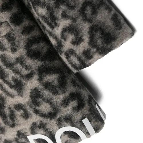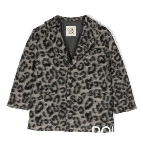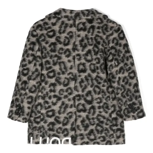 Черный, пепельно-серый, смесовая шерсть, подкладка из хлопка, сплошной леопардовый принт, логотип сбоку, зазубренные лацканы, застежка на пуговицах спереди, застежка на пуговицах спереди, прорезной карман на груди, два прорезных кармана спереди, длинные рукава, рукава с манжетами на пуговицах и прямой подол.