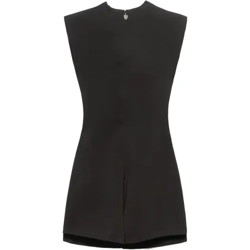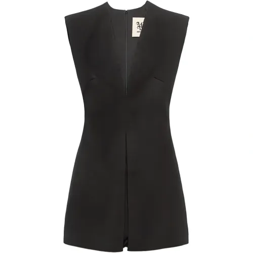 черный комбинезон с V-образным вырезом, без рукавов, скрытая застежка-молния, разрез спереди, короткие брючины