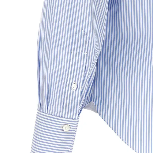 светло-голубая рубашка в полоску, застёжка на пуговицы, длинные рукава, детали с логотипом на манжетах