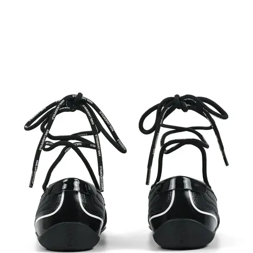 чёрные с завязками, круглый мыс, многослойный дизайн, плоская подошва
