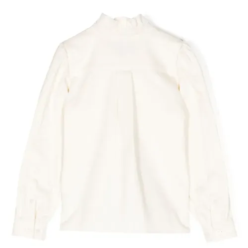 Белый/черный, хлопок, принт на груди, воротник с оборками, застежка на пуговицах спереди, длинные рукава, манжеты на пуговицах и прямой подол. Узнать больше о том, какие товары получают отметку «Ответственный выбор», можно из материала «Как мы оцениваем экологичность и этичность».