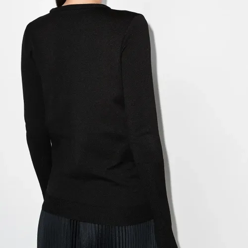 Трикотажный материал, логотип в технике интарсия, детали с оборками, круглый вырез, длинные рукава и прямой подол. Цвет: черный.