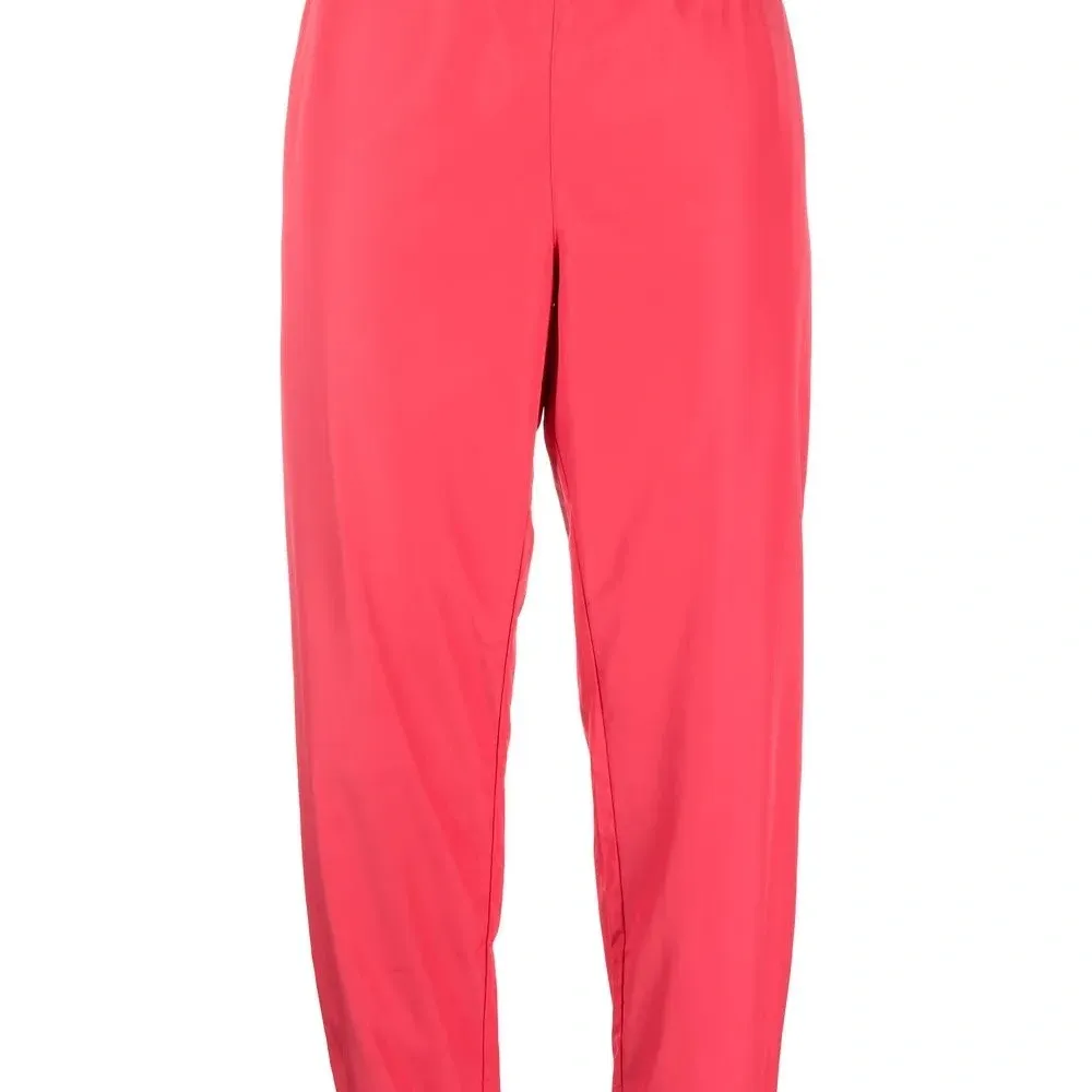 Красный, эластичный пояс, эластичные манжеты и два прорезных кармана по бокам.