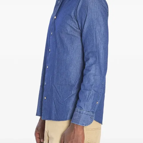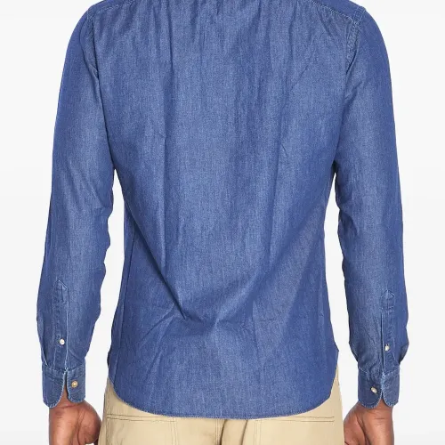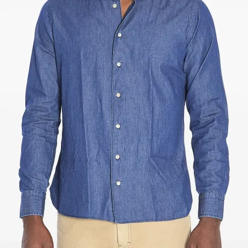 синяя рубашка-поло с застежкой на пуговицы, манжетами на пуговицах и округлым подолом