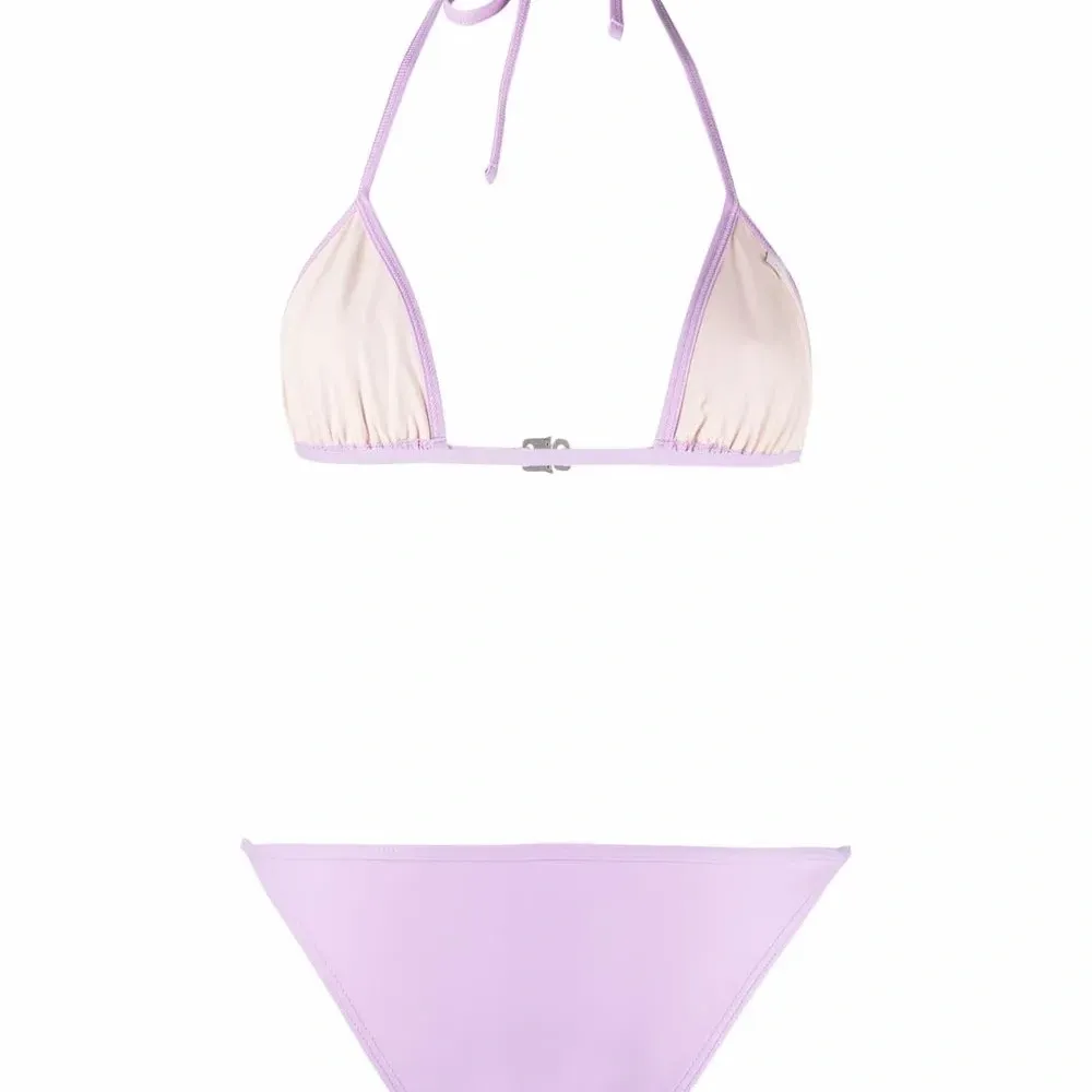 Эластичная модель, треугольная чашка, вырез-петля халтер и классические плавки бикини. Пожалуйста, примеряйте купальники и пляжные шорты только поверх собственного белья.