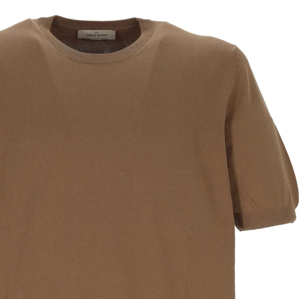 коричневый, с ребристым подолом, короткими рукавами, круглым вырезом, ребристыми манжетами, мелкая вязка