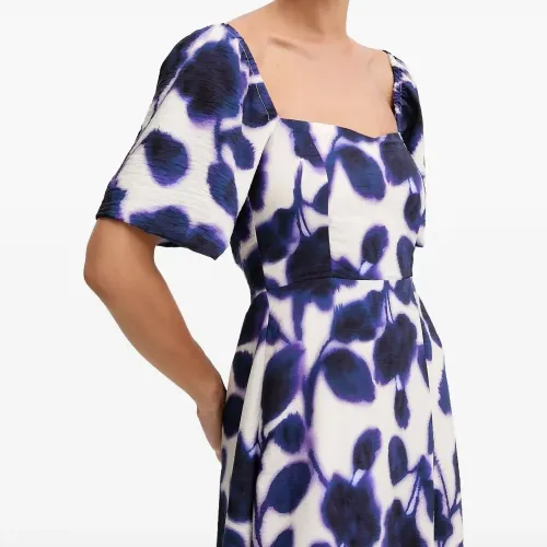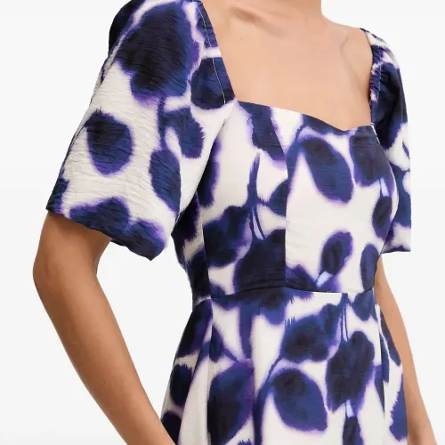 синее и белое платье с цветочным принтом, квадратным вырезом, короткими рукавами, разрезом сбоку и сборкой на спинке