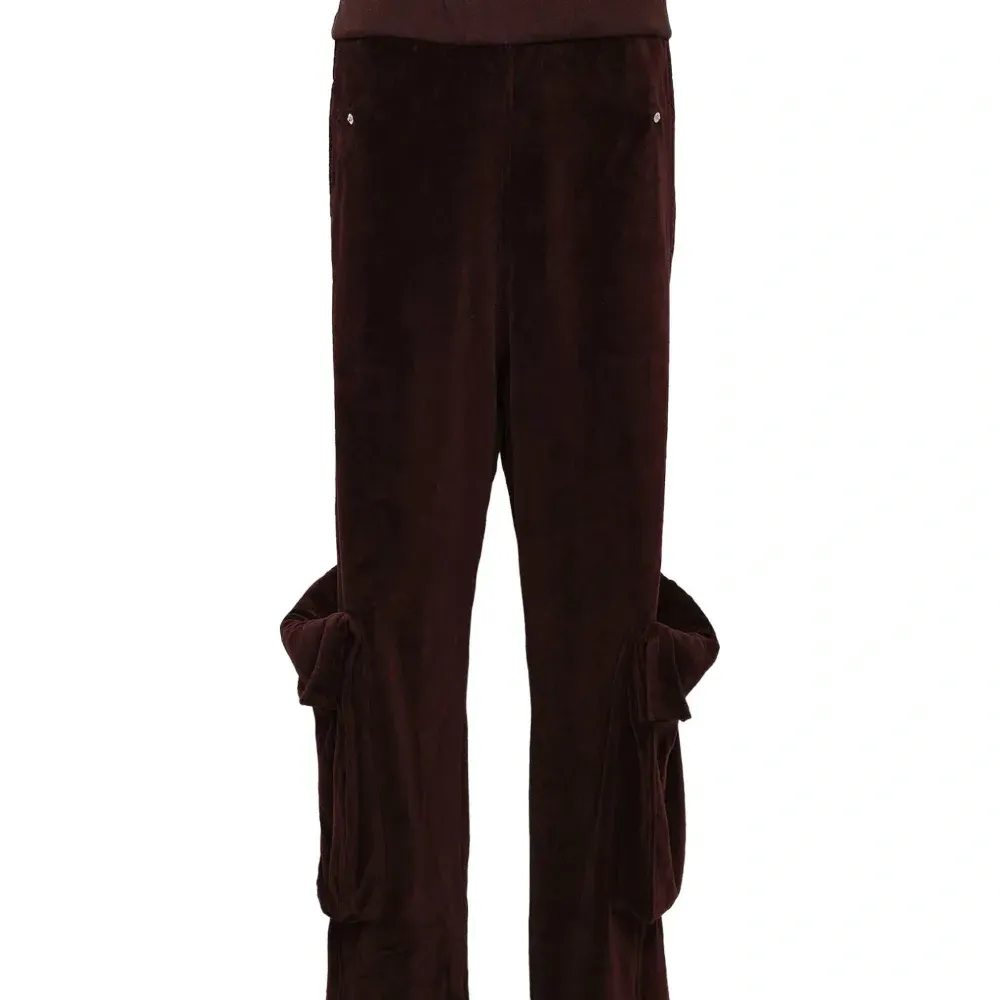 коричневые брюки с отворотом на талии, накладными карманами, бантом и бархатистой текстурой