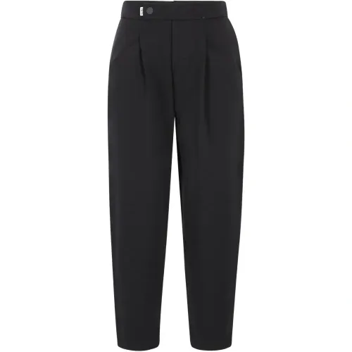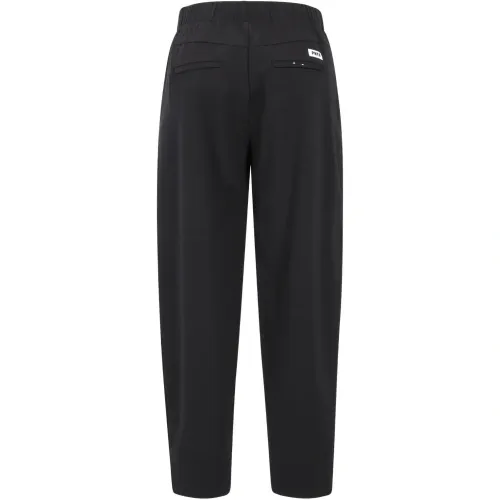 черные брюки со складками, задними прорезными карманами, прямыми штанинами, боковыми карманами и эластичным поясом сзади