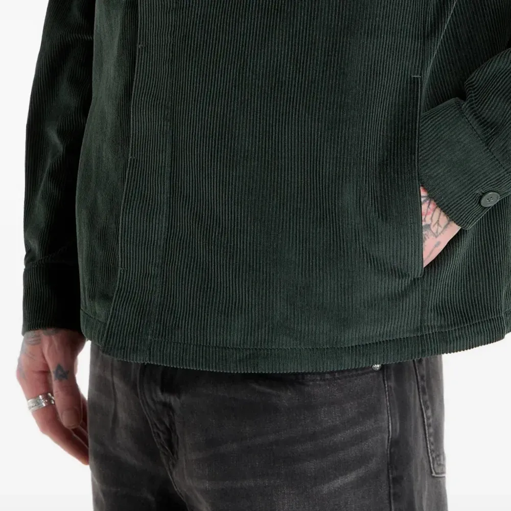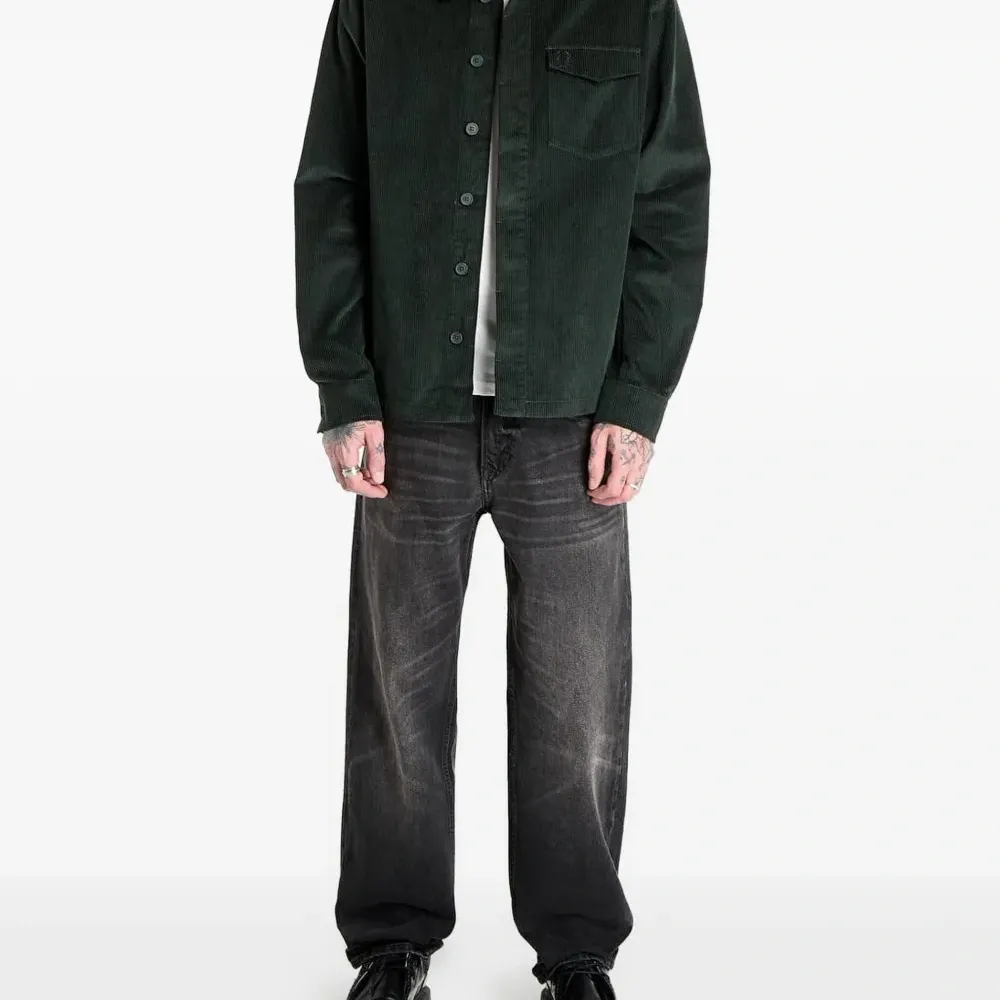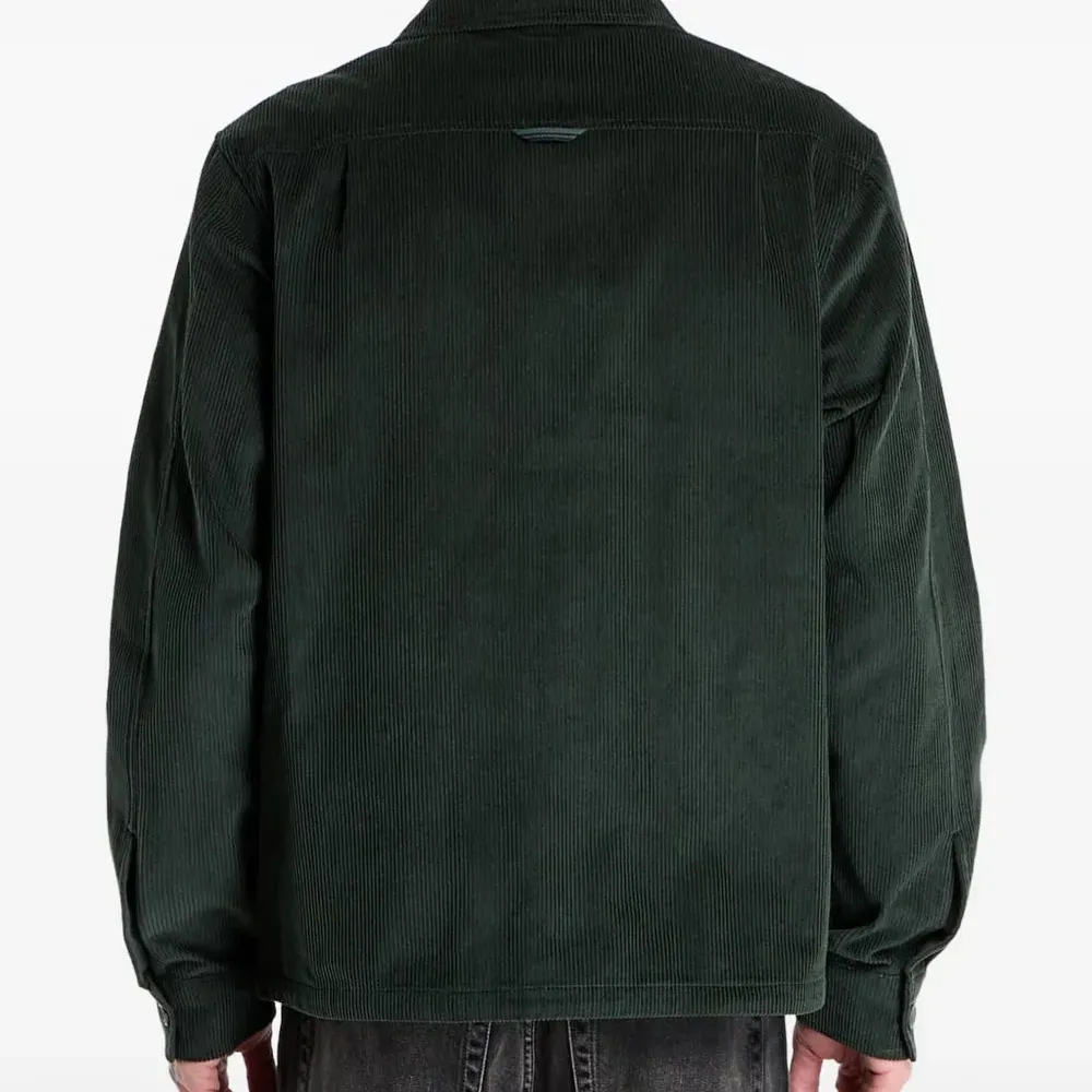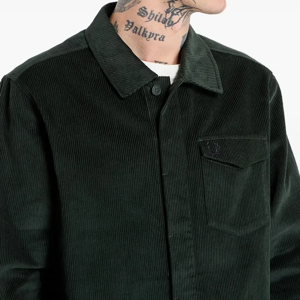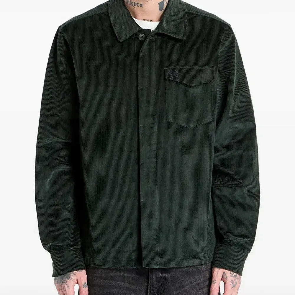 зеленая рубашка из вельвета с накладным карманом на груди, застежкой на пуговицы и длинными рукавами