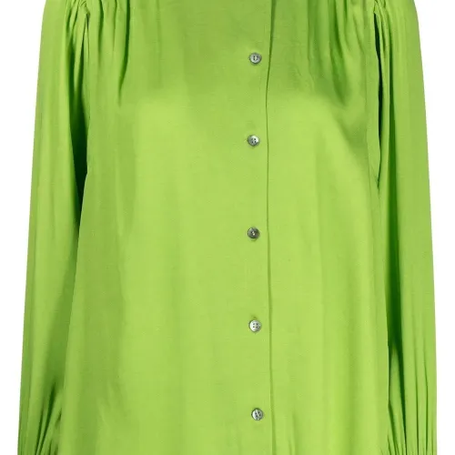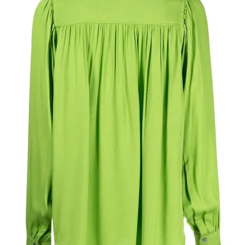 Цвет зеленого яблока, дизайн со сборками, закругленный подол, смещенная застежка на пуговицах спереди, рукава с манжетами на пуговицах и длинные рукава.