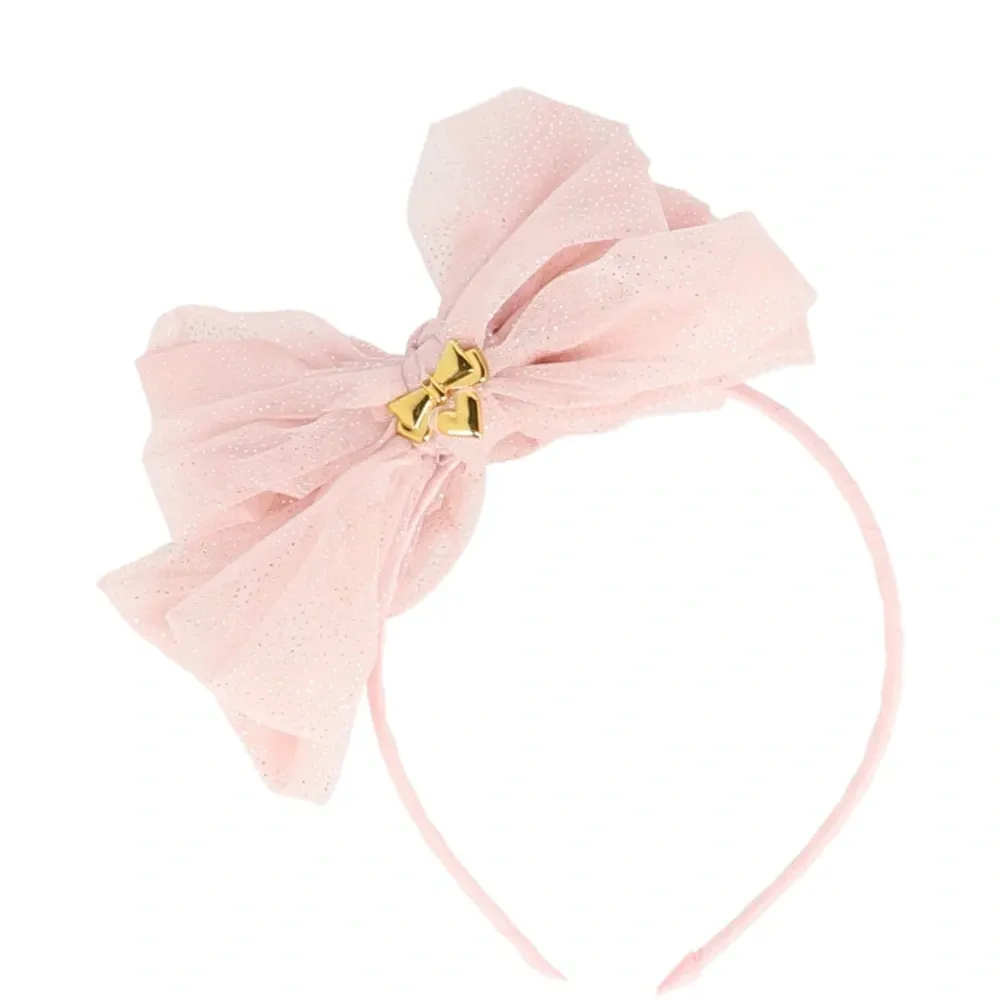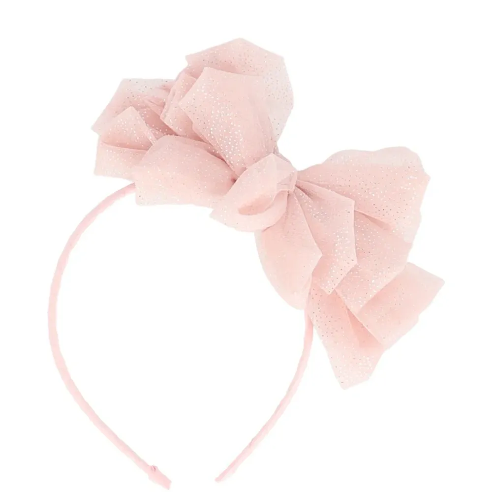 розовая повязка на голову с бантом и блестящими деталями