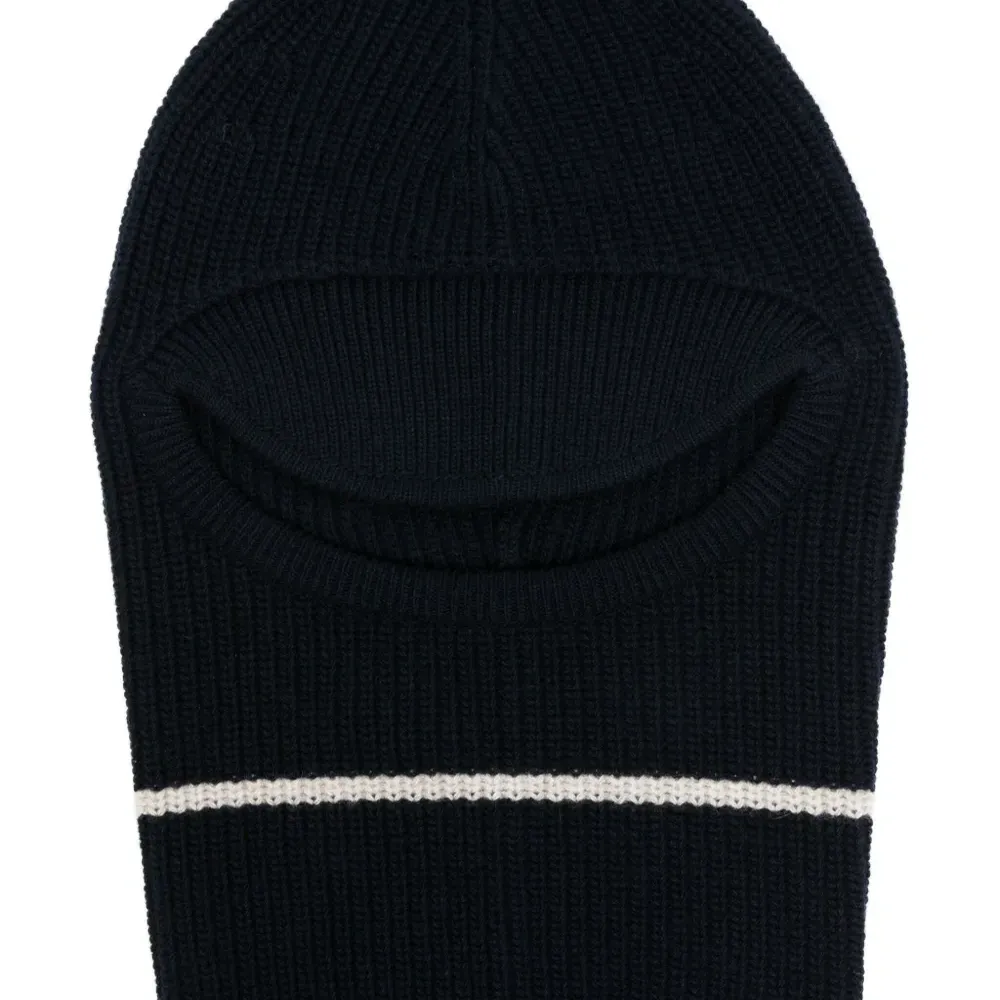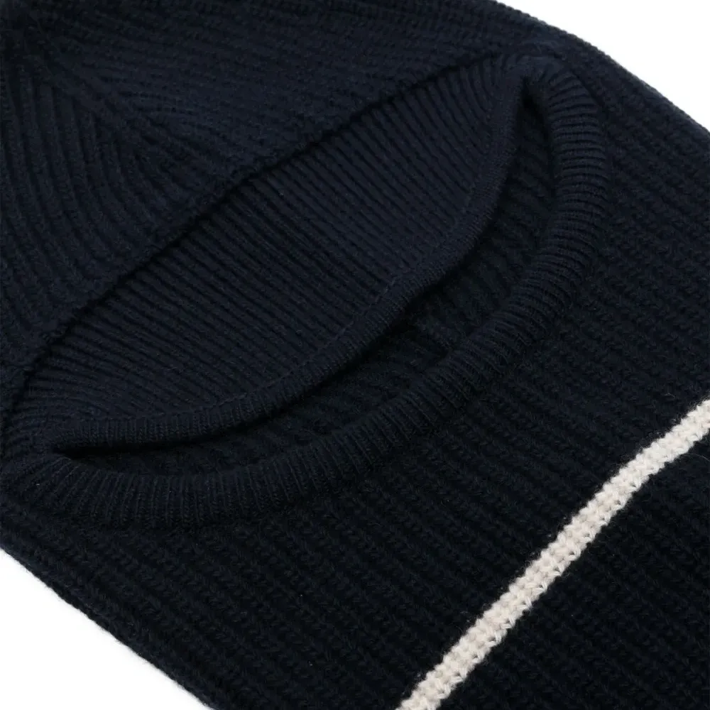 Темно-синий, кремово-белый, смесь шерсти и кашемира, трикотаж в рубчик, сочетание двух оттенков, полоски, вырезы для глаз и модель без застежки.