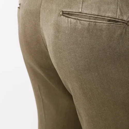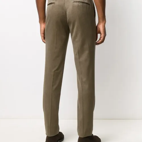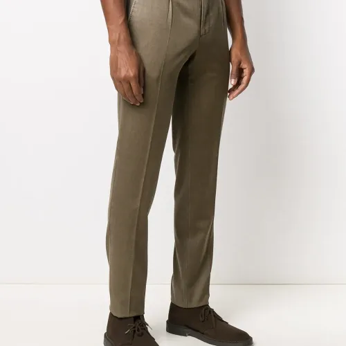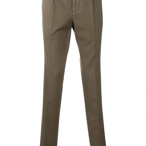 Застежка на крючке спереди, петли для ремня, прорезные карманы по бокам, встречная складка, стрелки и два кармана с листочкой сзади. Цвет: коричневый.