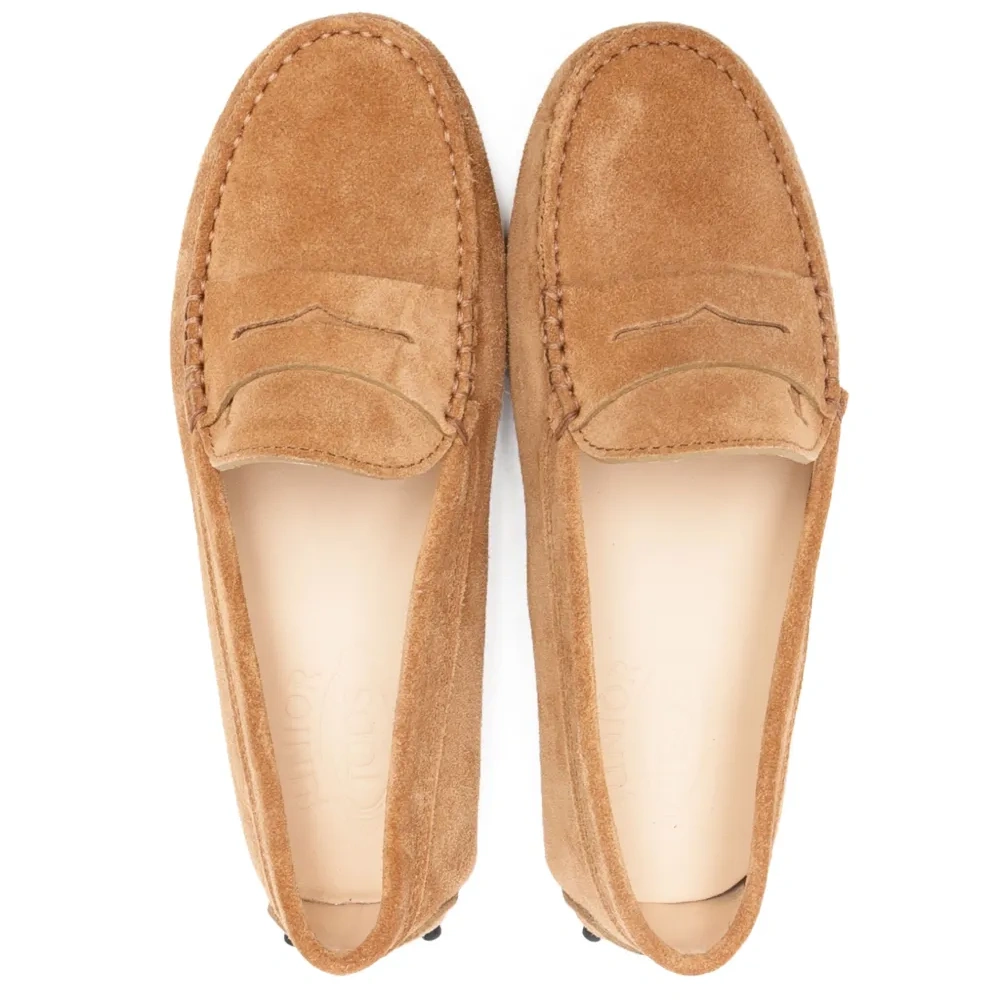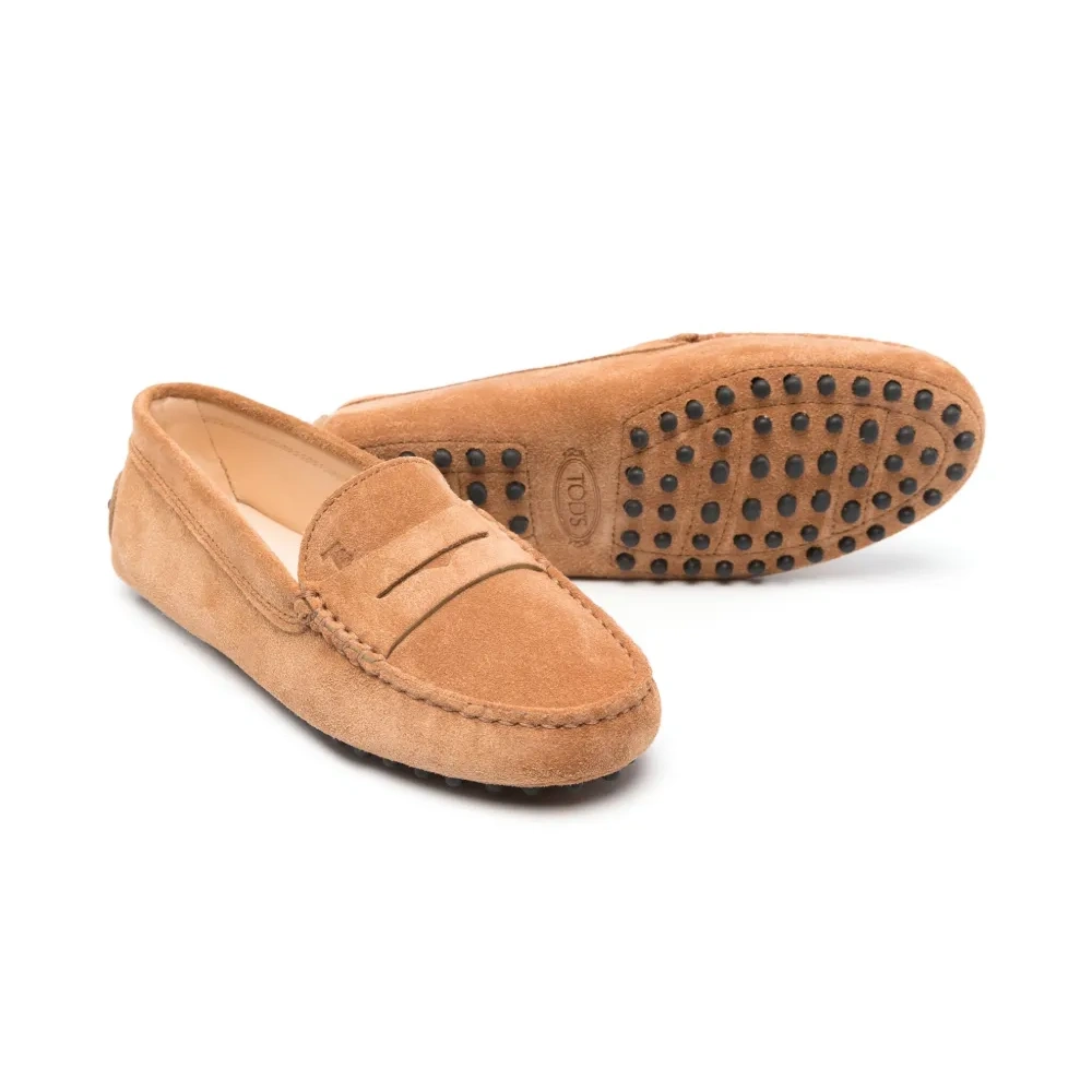 Бежево-коричневый, телячья кожа, тисненый логотип спереди, прорези на язычке, закругленный носок, резиновые накладки и плоская подошва.