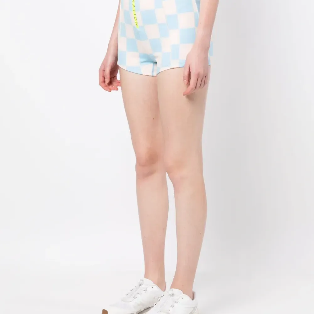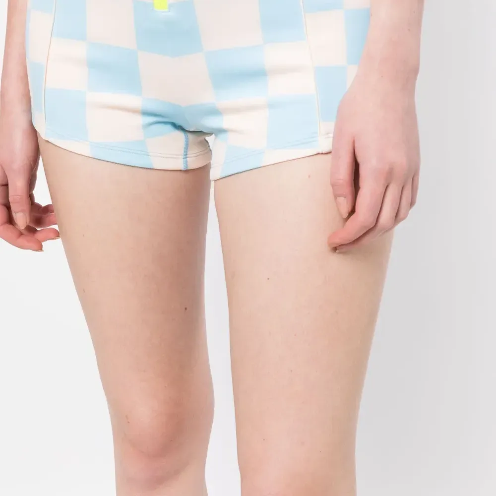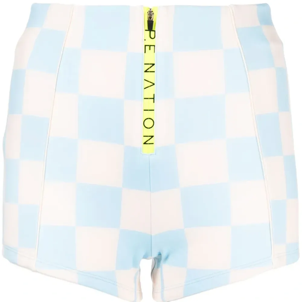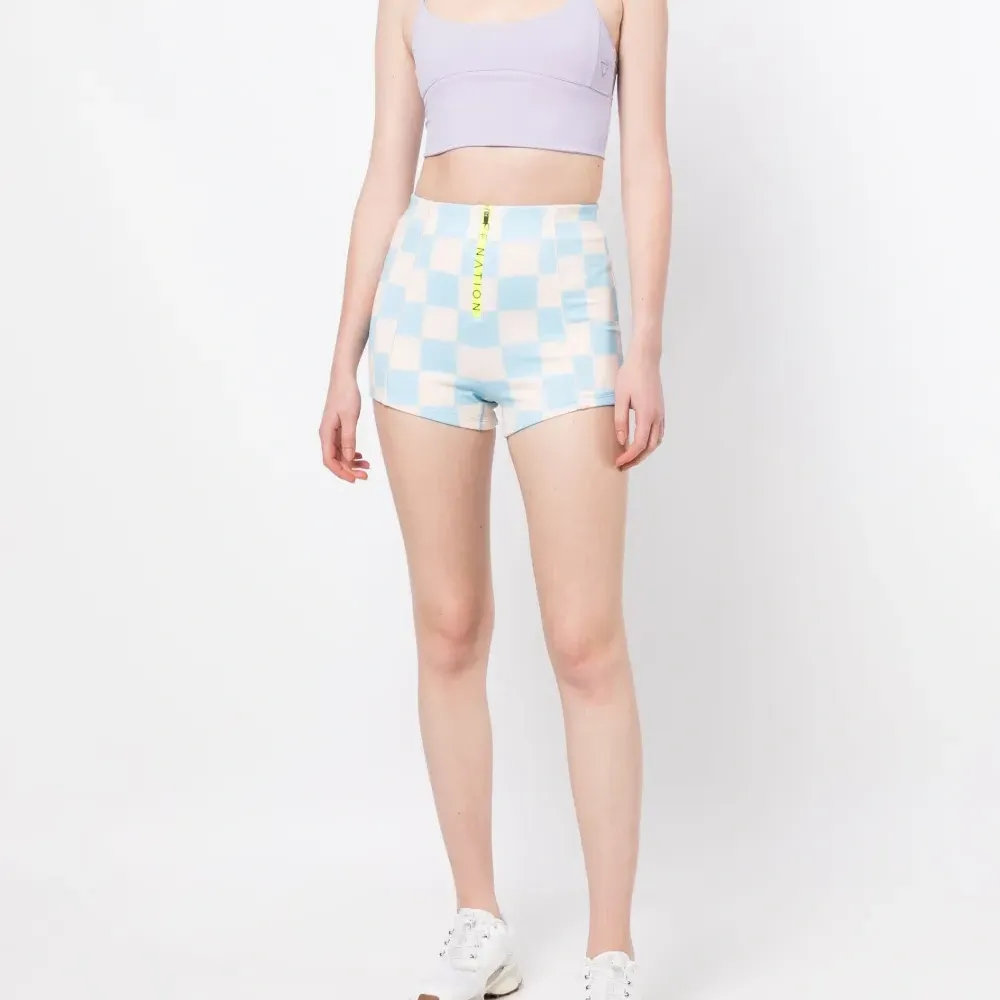 Голубой, флуоресцентный желтый, кремово-белый, принт в шахматную клетку, логотип спереди, завышенная талия, застежка на молнии спереди и прямой подол.