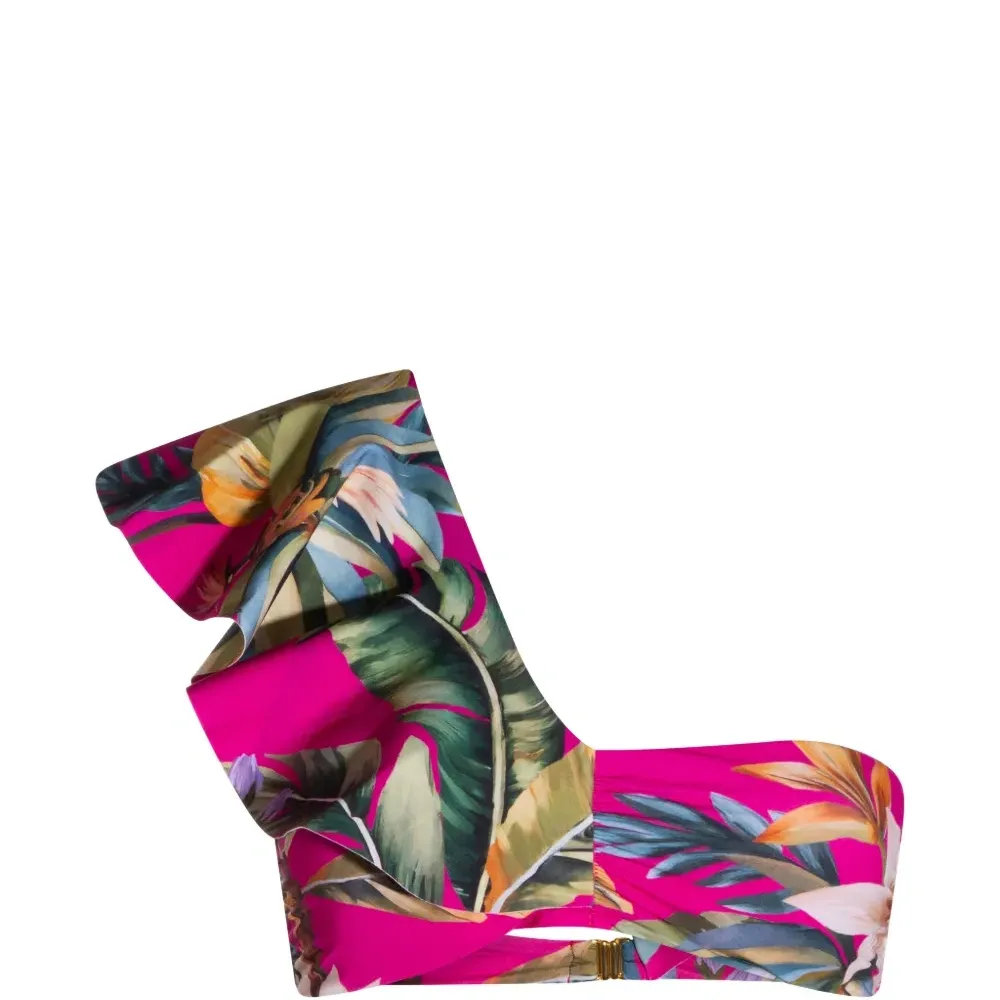 розовый/многоцветный купальник на одно плечо с цветочным принтом и оборками. Пожалуйста, примерьте купальник поверх собственной одежды.