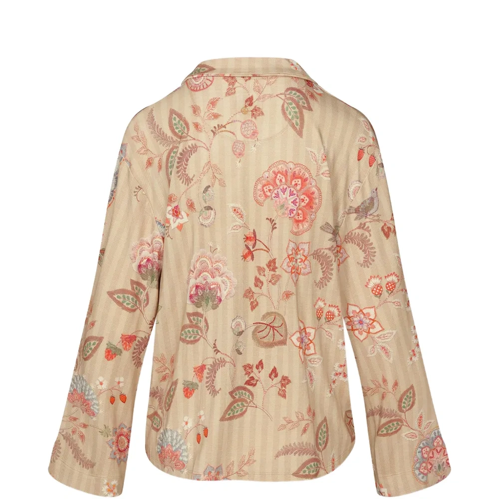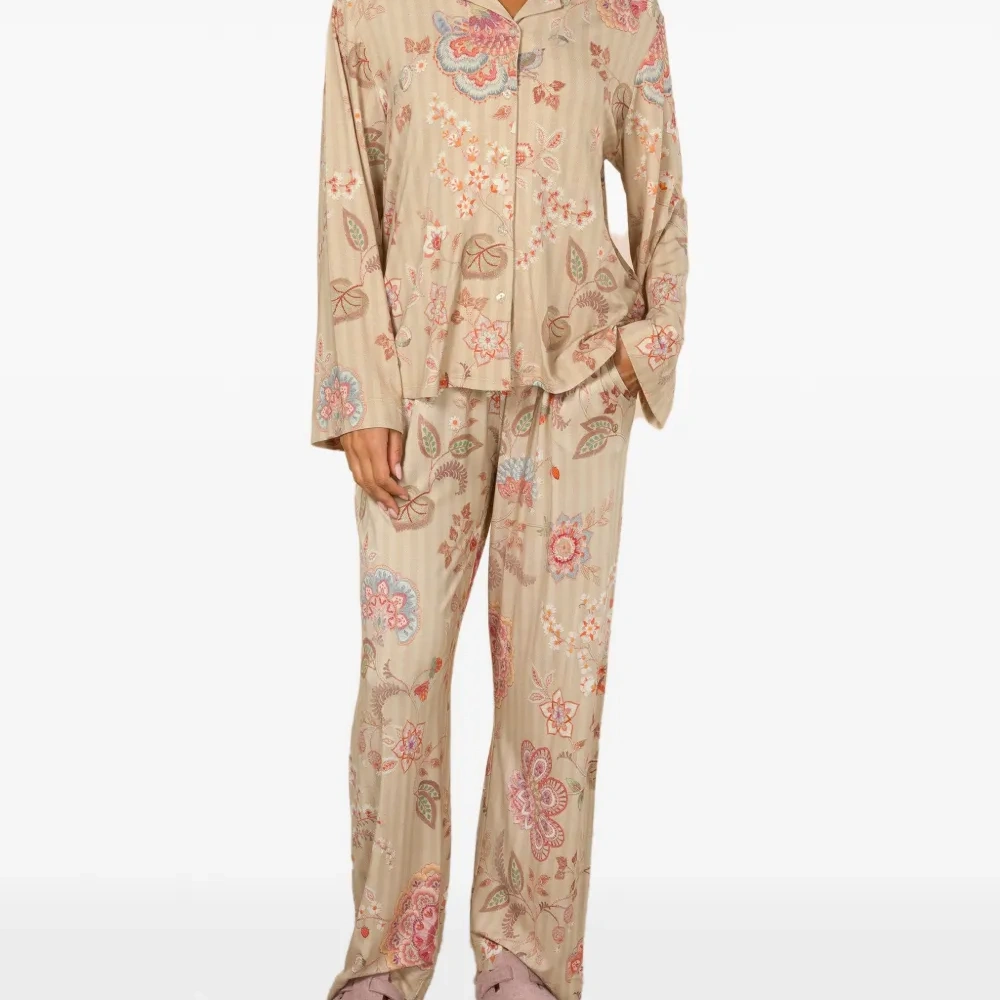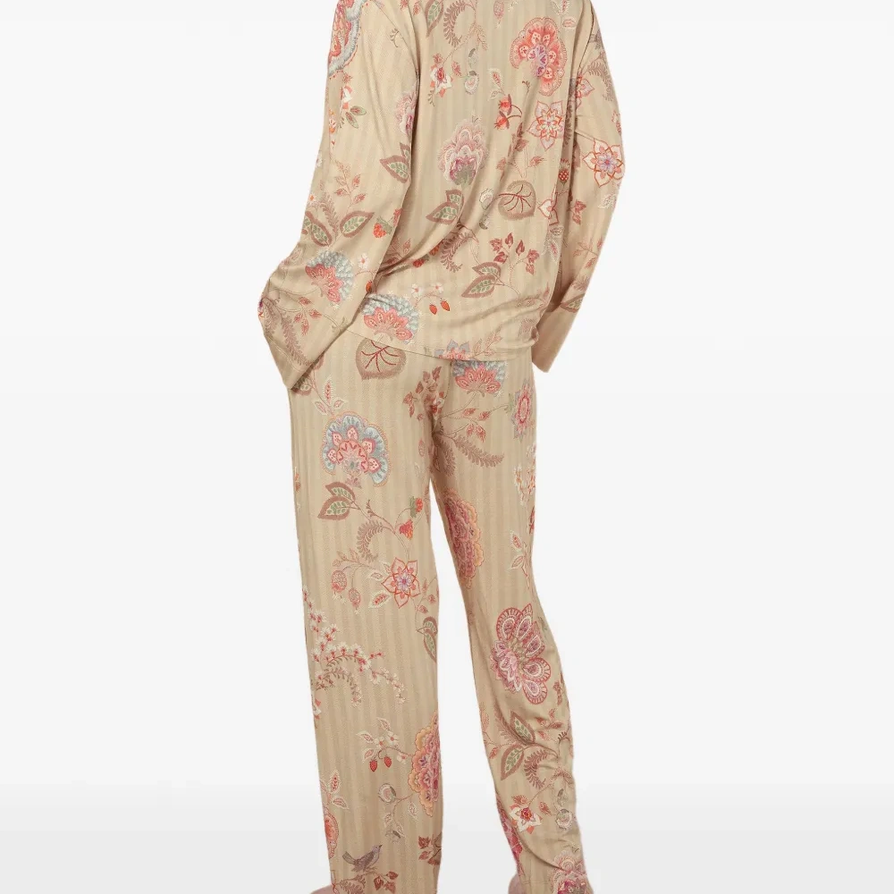 светло-коричневый с цветочным принтом, в полоску, застежка на пуговицы, длинные рукава