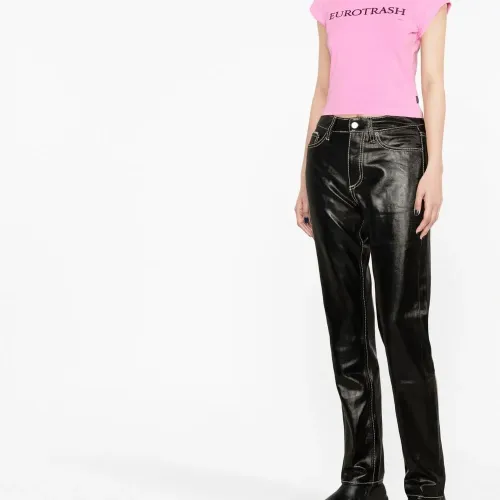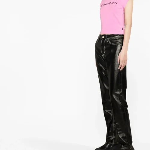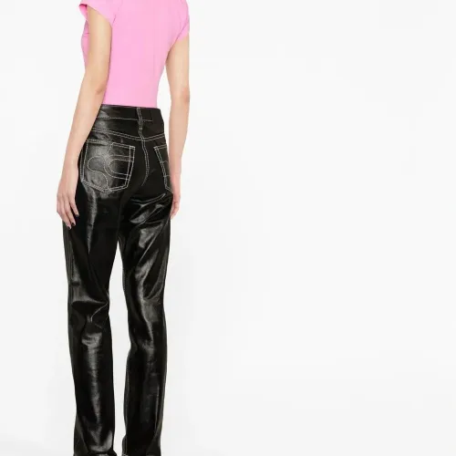 Черный, хлопок, лакированное покрытие, средняя посадка, прямой крой, потайная застежка на молнии и пуговицах, пять карманов и прямой подол.