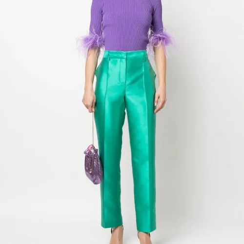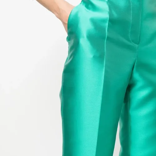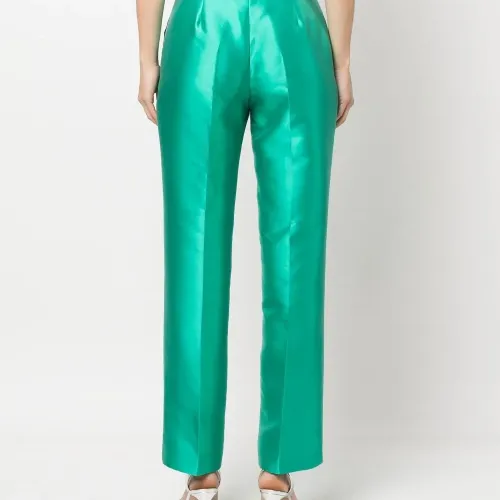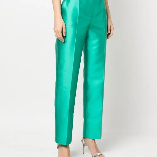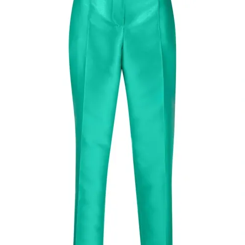 Бирюзовый, сатиновая фактура, стрелки, потайная застежка спереди, петли для ремня, завышенная талия, два кармана по бокам, прямой крой и высота по щиколотку.