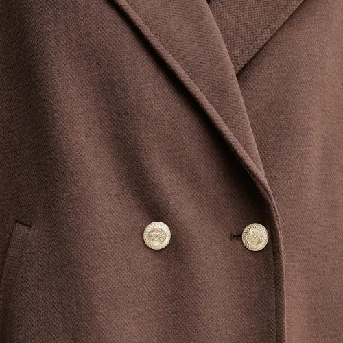 коричневый двубортный с боковыми разрезами и карманами, длинные рукава