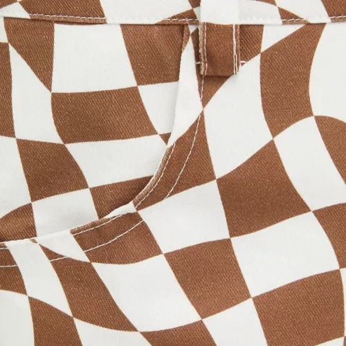 коричнево-белый узор в шашку, боковые прорезные карманы, шлевки для ремня, застежка на верхнюю пуговицу, гульфик на молнии