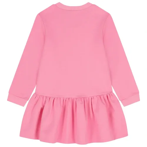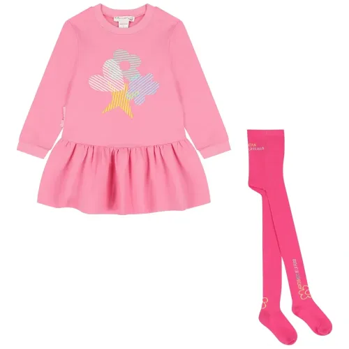 розовое платье с графическим принтом, круглым вырезом, длинными рукавами, плиссированной юбкой, в комплекте с колготками