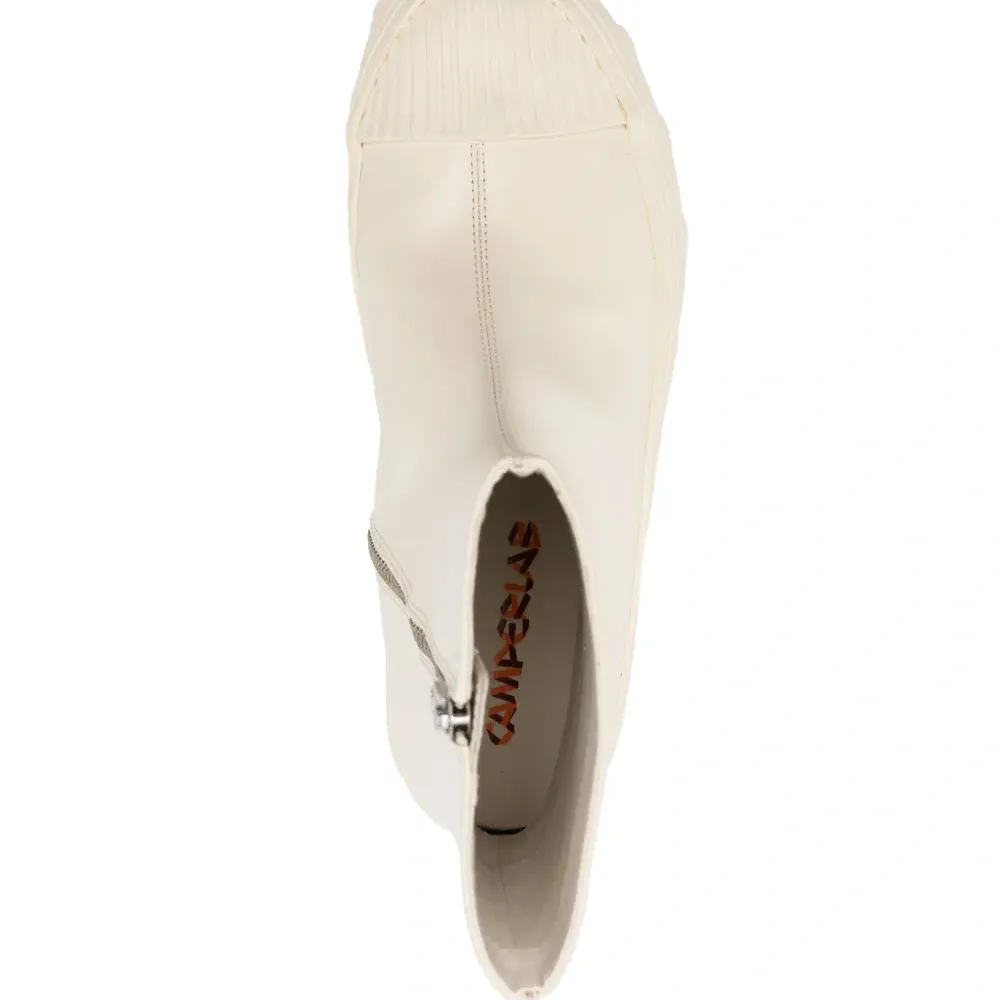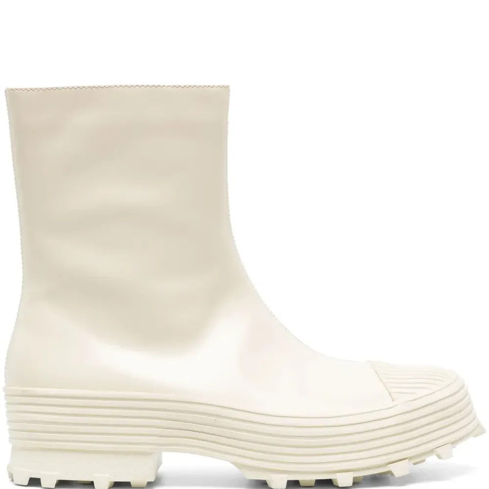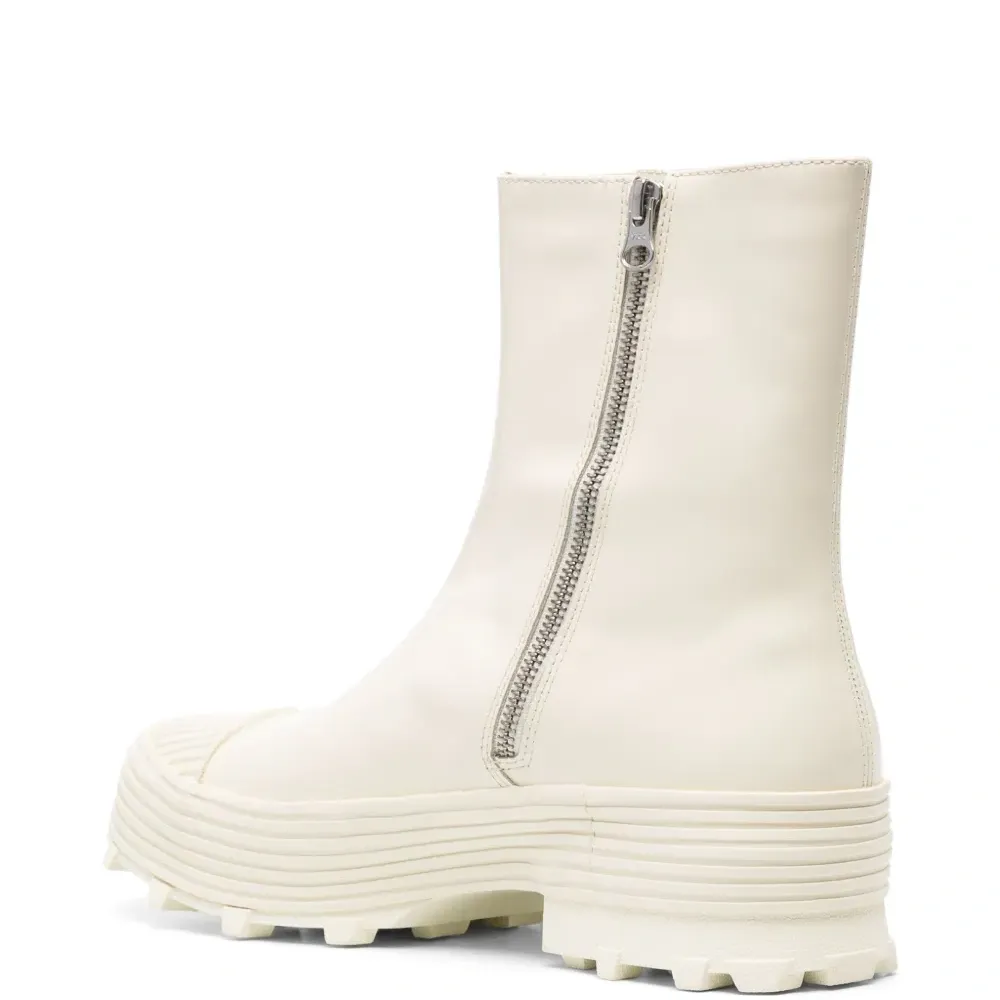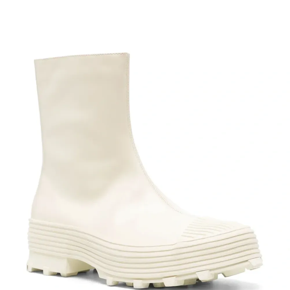 Белый, телячья кожа, гладкая текстура кожи, строчка в тон, длина до середины голени, застежка на молнии сбоку, носок в тон, закругленный носок и массивная резиновая подошва. Это унисекс-модель. Обратите внимание, что для нее используется мужская размерная сетка. Этот товар как минимум на 50% состоит из переработанных или повторно использованных материалов.