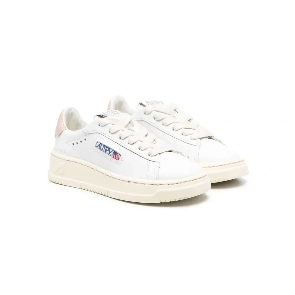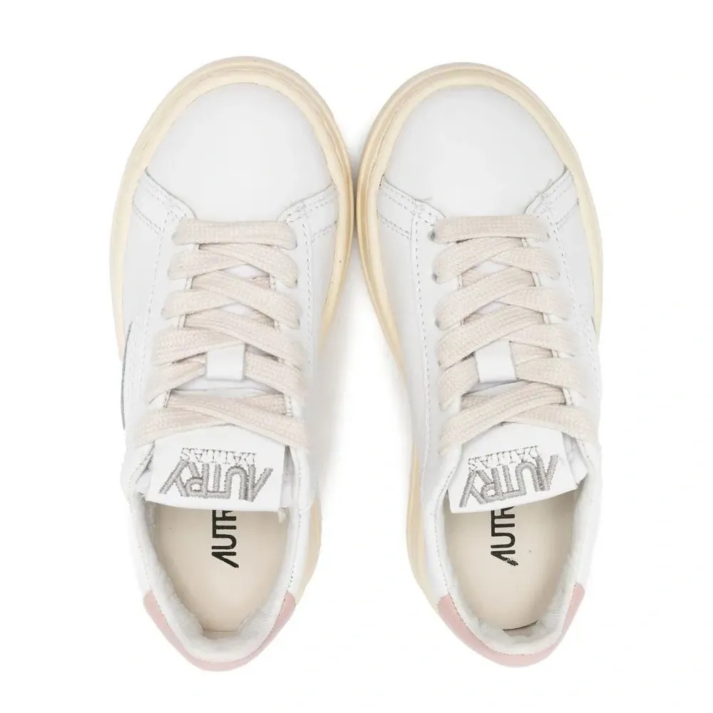 Белый, розовый, телячья кожа, нашивка с логотипом сбоку, перфорация, шнуровка спереди, контрастный задник, закругленный носок, стелька с логотипом и плоская резиновая подошва.