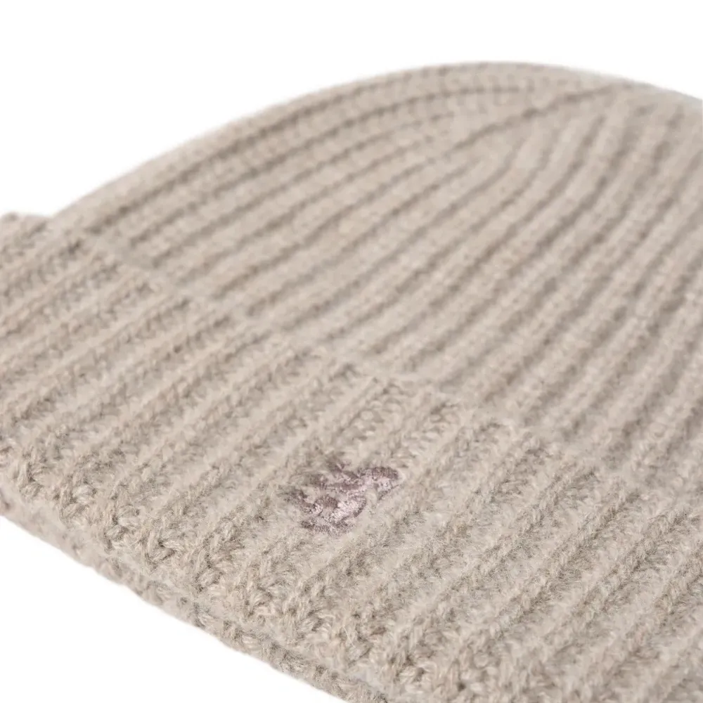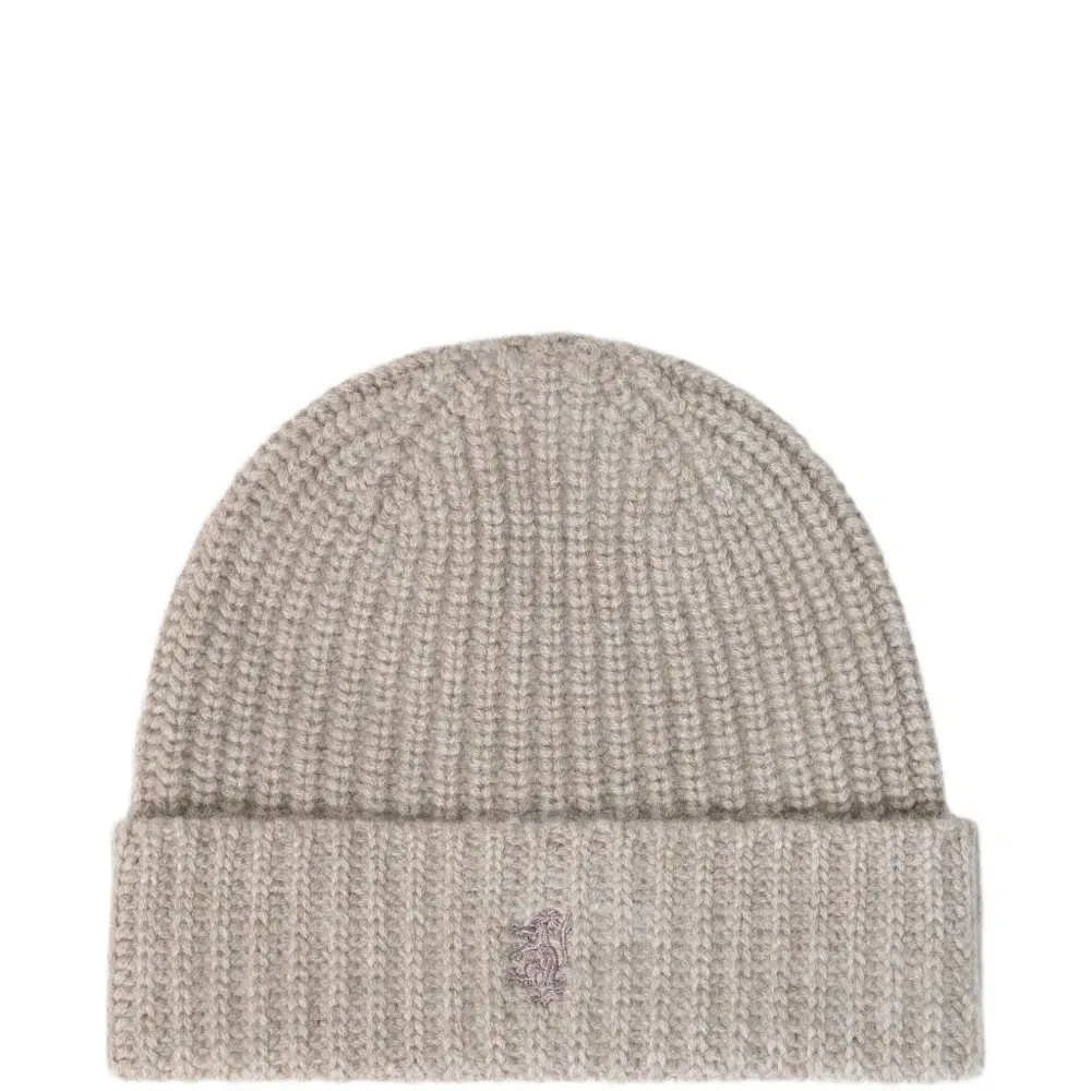 трикотажная шапка из кашемира грибного оттенка с отворотом и вышивкой логотипа