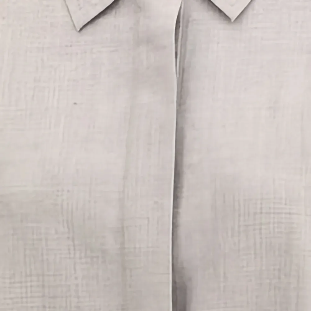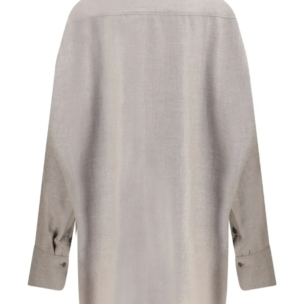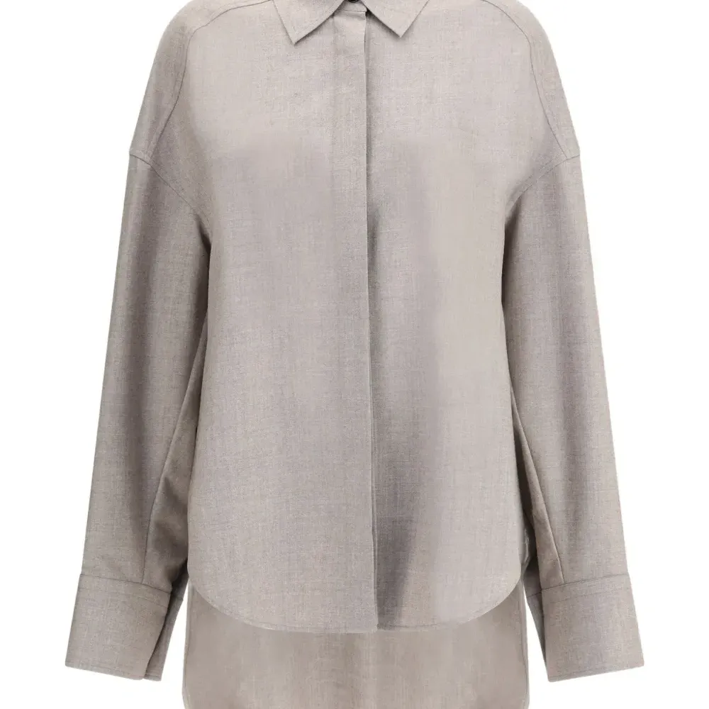 серый топ с изогнутым подолом, длинными рукавами, застёжкой на пуговицы, отложным воротником и свободным кроем