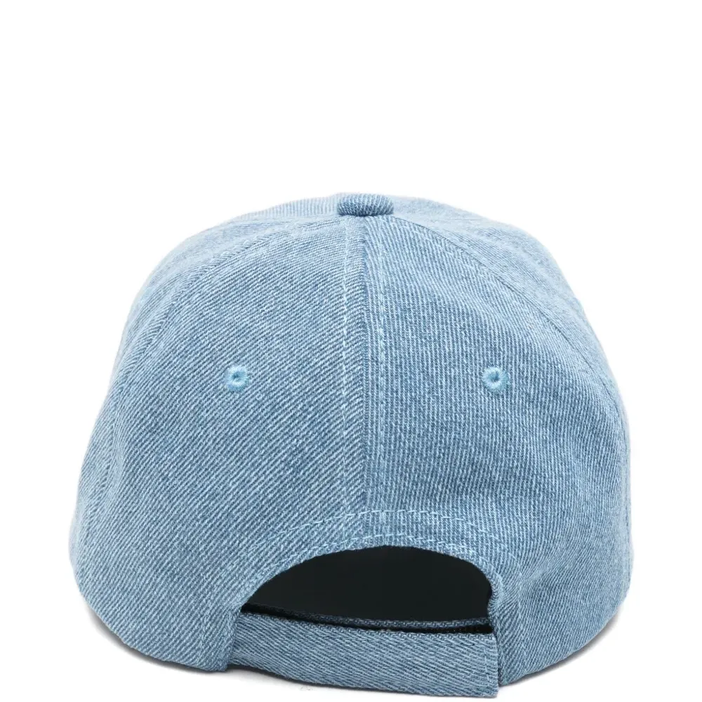 синяя кепка с вышитым логотипом, верхней пуговицей, изогнутым козырьком, деталями в виде люверсов, регулируемым размером