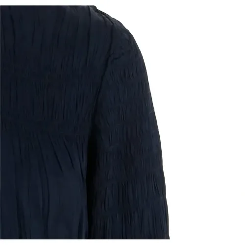 темно-синий свитер с круглым вырезом, присборенными деталями, длинными рукавами и завязкой на спине