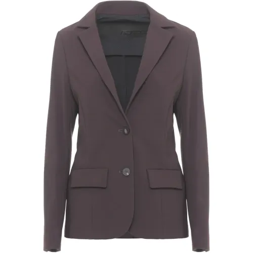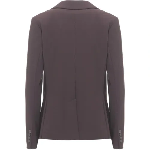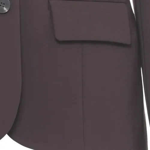 бордовый цвет, лацканы с выемками, застежка на пуговицы спереди, длинные рукава, манжеты на пуговицах, накладные карманы спереди