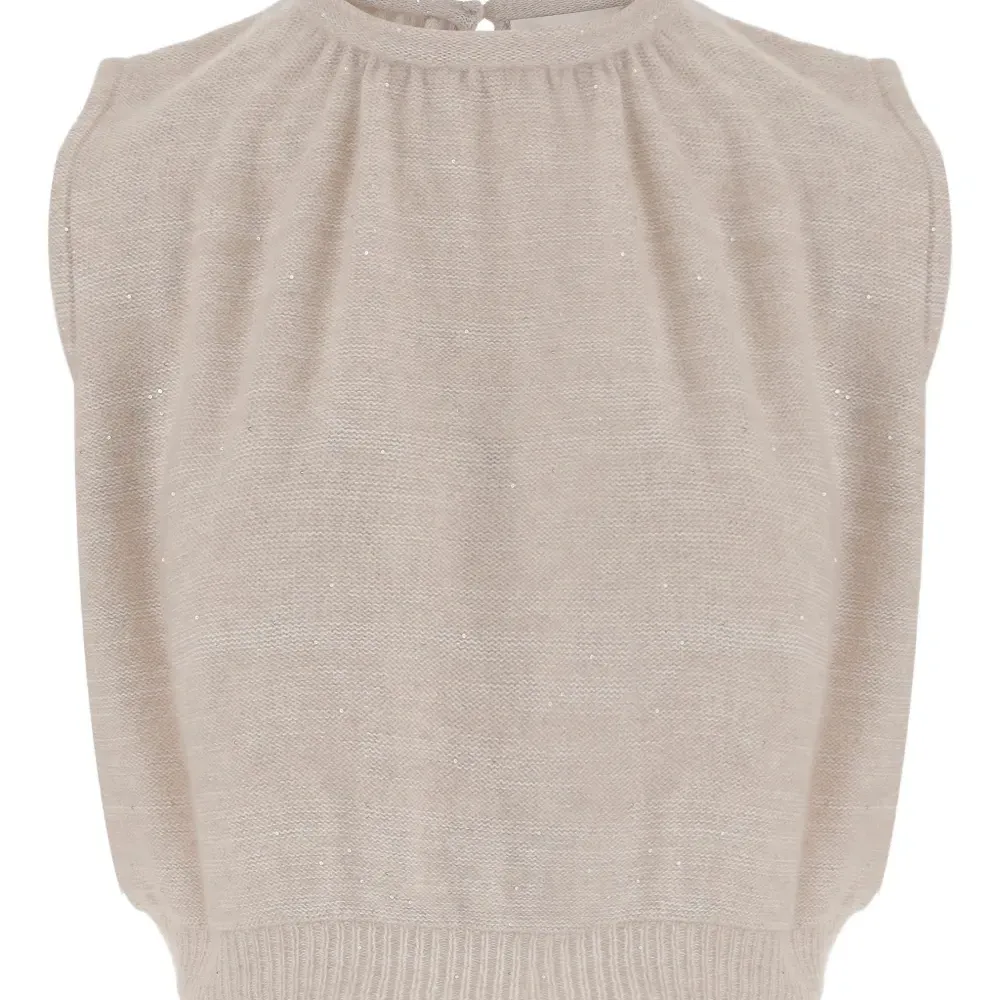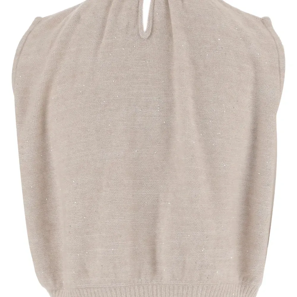 бежевый цвет, украшение пайетками, круглый вырез горловины, застежка сзади на пуговицу, вырез на спине